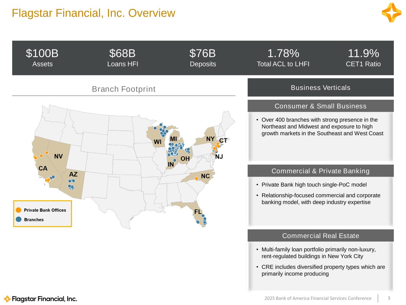 32025 Bank of America Financial Services Conference Flagstar Financial, Inc. Overview $100B Assets $76B Deposits $68B Loans HFI 1.78% Total ACL to LHFI 11.9% CET1 Ratio Branch Footprint • Over 400 branches with strong presence in the Northeast and Midwest and exposure to high growth markets in the Southeast and West Coast Consumer & Small Business • Private Bank high touch single-PoC model • Relationship-focused commercial and corporate banking model, with deep industry expertise Commercial & Private Banking • Multi-family loan portfolio primarily non-luxury, rent-regulated buildings in New York City • CRE includes diversified property types which are primarily income producing Commercial Real Estate Business Verticals