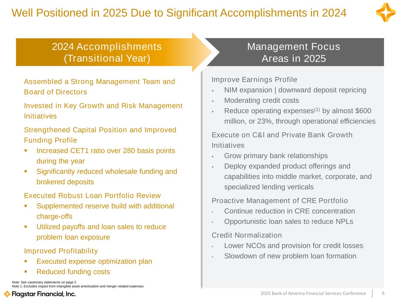 52025 Bank of America Financial Services Conference Our Five Areas of Strategic Focus Long-Term Targets Strategic Update ▪ Top quartile CET1 capital ratio of 11.9%; above our long-term target range ▪ On track to reach profitability by full year 2026 forecast ▪ Decreased provision for credit losses during the fourth quarter consistent with portfolio clean up ▪ Significant progress in reducing operating expenses through cost optimization efforts Achievable Capital and Earnings Forecast ▪ Annual CRE loan review complete ▪ De-risked the office and multi-family portfolios through charge-offs, payoffs and loan sales ▪ Maintained a solid ACL coverage ratio of 1.78% ▪ New classified loan formation has slowed Improve Funding Profile ▪ Strong liquidity profile of $31.8 billion ▪ Reduced wholesale borrowings by almost $7 billion, or 34% during the year; now represents 13% of total assets ▪ Loan-to-deposit ratio of 90% ▪ Reduced high-cost brokered CDs by $2.5 billion Focus on Credit and Risk Management ▪ Third consecutive quarter of solid deposit growth in the retail channel and private banking group ▪ Continue to reduce CRE exposure ▪ Proactive management of problem loans ▪ Successfully completed the sale of mortgage warehouse, mortgage servicing/sub- servicing businesses Ongoing Execution of Operating Plan ▪ Completed executive management hires ▪ Meaningfully strengthened the Company’s credit, risk, compliance, audit, IT, and finance functions ▪ Investing heavily in the commercial and corporate banking group Bolster Management and Talent ROAA : 1%+ ROATCE: 11-12% CET1 Ratio: 10.5-11.5% 1 2 3 4 5