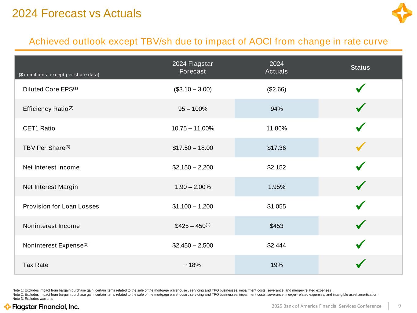 92025 Bank of America Financial Services Conference ($ in millions, except per share data) 2024 Flagstar Forecast 2024 Actuals Status Diluted Core EPS(1) ($3.10 – 3.00) ($2.66) ✓ Efficiency Ratio(2) 95 – 100% 94% ✓ CET1 Ratio 10.75 – 11.00% 11.86% ✓ TBV Per Share(3) $17.50 – 18.00 $17.36 ✓ Net Interest Income $2,150 – 2,200 $2,152 ✓ Net Interest Margin 1.90 – 2.00% 1.95% ✓ Provision for Loan Losses $1,100 – 1,200 $1,055 ✓ Noninterest Income $425 – 450(1) $453 ✓ Noninterest Expense(2) $2,450 – 2,500 $2,444 ✓ Tax Rate ~18% 19% ✓ 2024 Forecast vs Actuals Note 1: Excludes impact from bargain purchase gain, certain items related to the sale of the mortgage warehouse , servicing and TPO businesses, impairment costs, severance, and merger-related expenses Note 2: Excludes impact from bargain purchase gain, certain items related to the sale of the mortgage warehouse , servicing and TPO businesses, impairment costs, severance, merger-related expenses, and intangible asset amortization Note 3: Excludes warrants Achieved outlook except TBV/sh due to impact of AOCI from change in rate curve