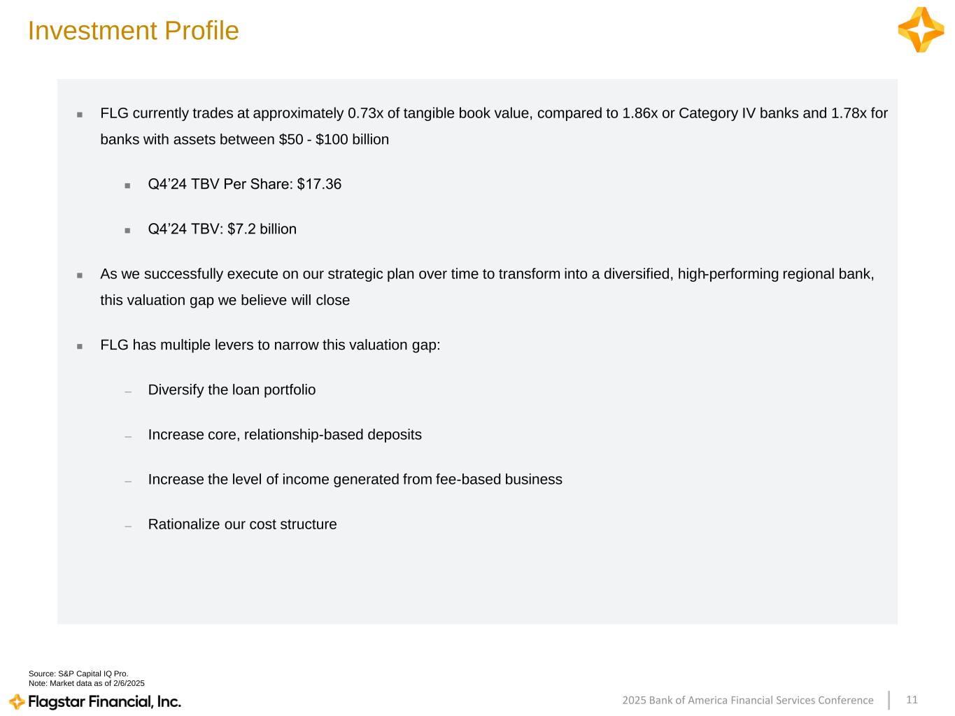 112025 Bank of America Financial Services Conference Investment Profile ◼ FLG currently trades at approximately 0.73x of tangible book value, compared to 1.86x or Category IV banks and 1.78x for banks with assets between $50 - $100 billion ◼ Q4’24 TBV Per Share: $17.36 ◼ Q4’24 TBV: $7.2 billion ◼ As we successfully execute on our strategic plan over time to transform into a diversified, high-performing regional bank, this valuation gap we believe will close ◼ FLG has multiple levers to narrow this valuation gap: — Diversify the loan portfolio — Increase core, relationship-based deposits — Increase the level of income generated from fee-based business — Rationalize our cost structure Source: S&P Capital IQ Pro. Note: Market data as of 2/6/2025