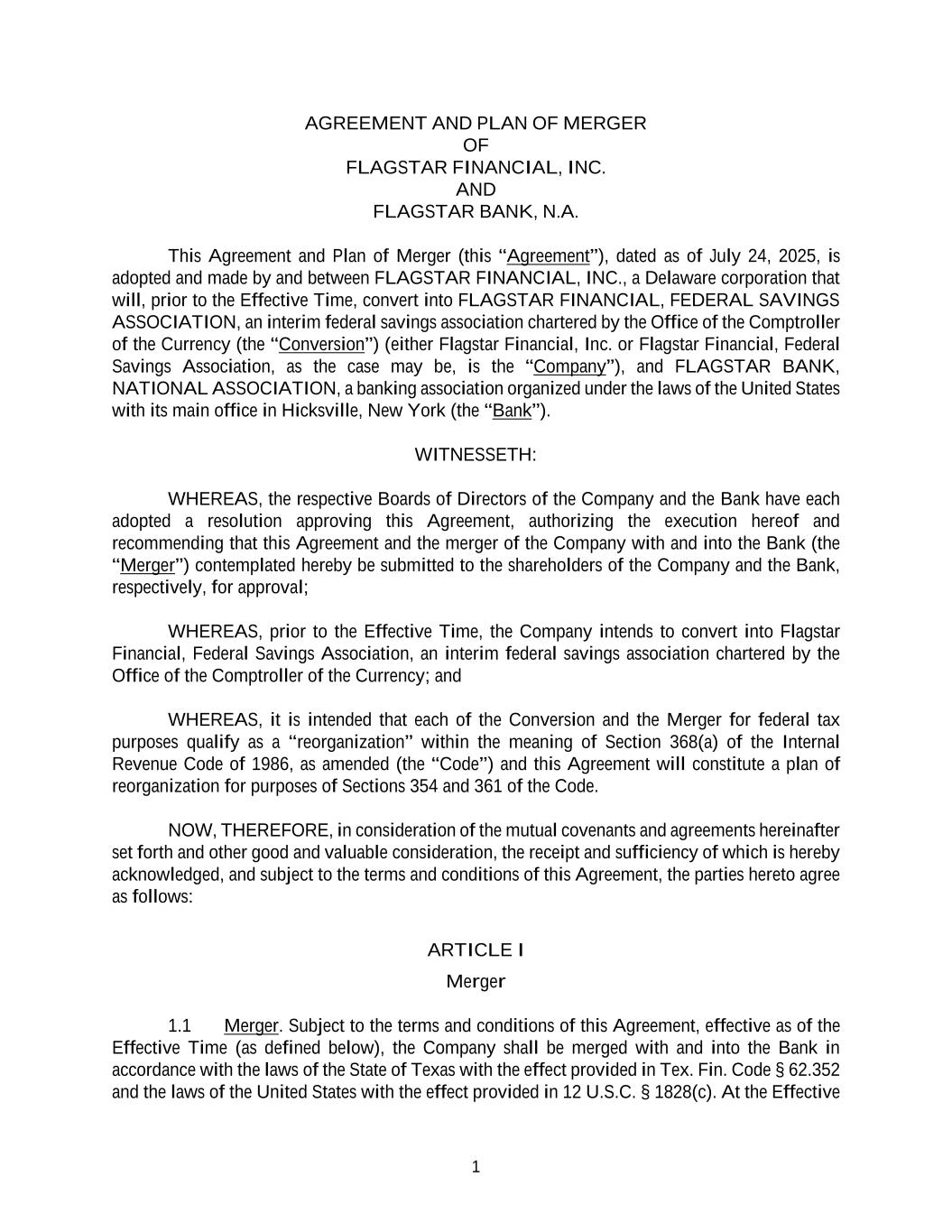 1 AGREEMENT AND PLAN OF MERGER OF FLAGSTAR FINANCIAL, INC. AND FLAGSTAR BANK, N.A. This Agreement and Plan of Merger (this “Agreement”), dated as of July 24, 2025, is adopted and made by and between FLAGSTAR FINANCIAL, INC., a Delaware corporation that will, prior to the Effective Time, convert into FLAGSTAR FINANCIAL, FEDERAL SAVINGS ASSOCIATION, an interim federal savings association chartered by the Office of the Comptroller of the Currency (the “Conversion”) (either Flagstar Financial, Inc. or Flagstar Financial, Federal Savings Association, as the case may be, is the “Company”), and FLAGSTAR BANK, NATIONAL ASSOCIATION, a banking association organized under the laws of the United States with its main office in Hicksville, New York (the “Bank”). WITNESSETH: WHEREAS, the respective Boards of Directors of the Company and the Bank have each adopted a resolution approving this Agreement, authorizing the execution hereof and recommending that this Agreement and the merger of the Company with and into the Bank (the “Merger”) contemplated hereby be submitted to the shareholders of the Company and the Bank, respectively, for approval; WHEREAS, prior to the Effective Time, the Company intends to convert into Flagstar Financial, Federal Savings Association, an interim federal savings association chartered by the Office of the Comptroller of the Currency; and WHEREAS, it is intended that each of the Conversion and the Merger for federal tax purposes qualify as a “reorganization” within the meaning of Section 368(a) of the Internal Revenue Code of 1986, as amended (the “Code”) and this Agreement will constitute a plan of reorganization for purposes of Sections 354 and 361 of the Code. NOW, THEREFORE, in consideration of the mutual covenants and agreements hereinafter set forth and other good and valuable consideration, the receipt and sufficiency of which is hereby acknowledged, and subject to the terms and conditions of this Agreement, the parties hereto agree as follows: ARTICLE I Merger 1.1 Merger. Subject to the terms and conditions of this Agreement, effective as of the Effective Time (as defined below), the Company shall be merged with and into the Bank in accordance with the laws of the State of Texas with the effect provided in Tex. Fin. Code § 62.352 and the laws of the United States with the effect provided in 12 U.S.C. § 1828(c). At the Effective
