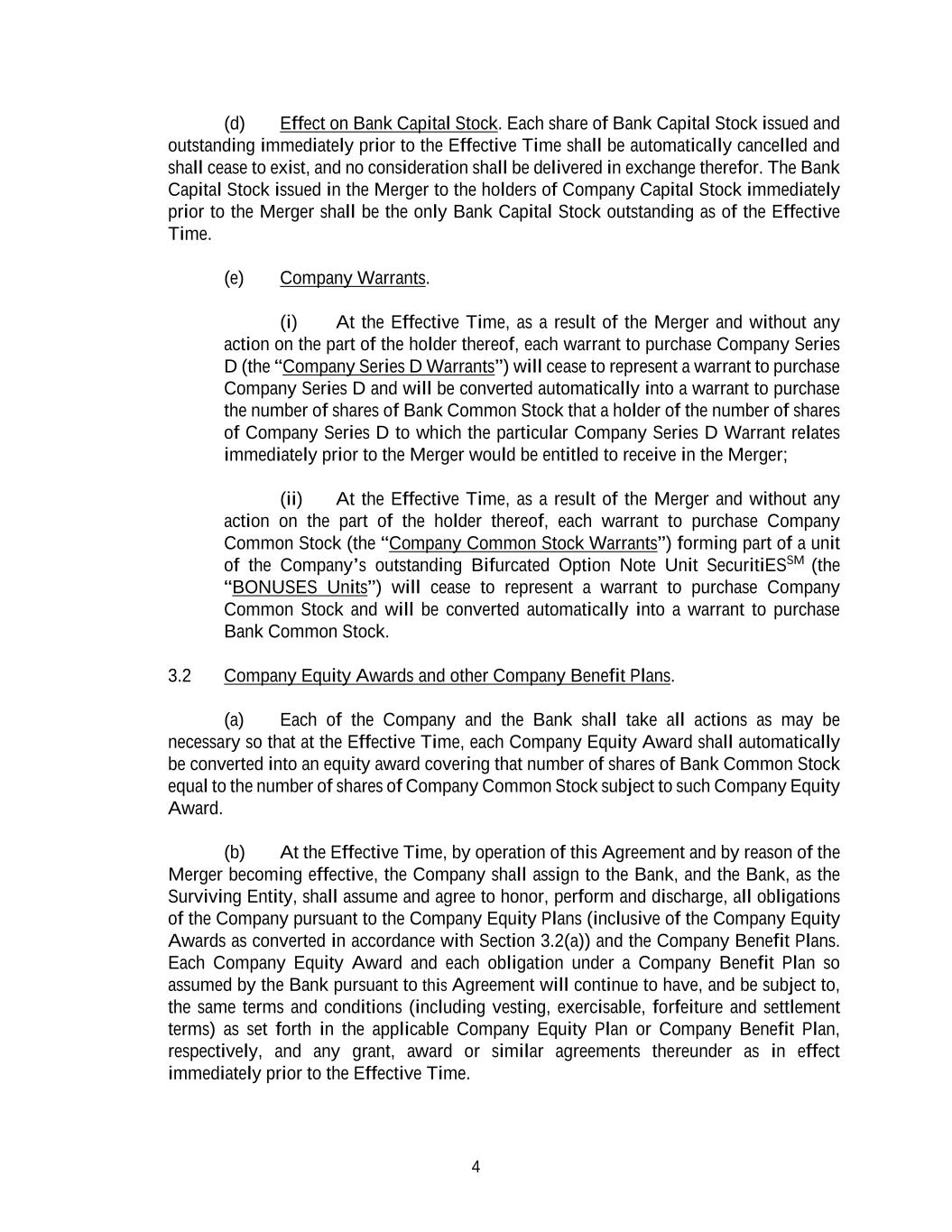 4 (d) Effect on Bank Capital Stock. Each share of Bank Capital Stock issued and outstanding immediately prior to the Effective Time shall be automatically cancelled and shall cease to exist, and no consideration shall be delivered in exchange therefor. The Bank Capital Stock issued in the Merger to the holders of Company Capital Stock immediately prior to the Merger shall be the only Bank Capital Stock outstanding as of the Effective Time. (e) Company Warrants. (i) At the Effective Time, as a result of the Merger and without any action on the part of the holder thereof, each warrant to purchase Company Series D (the “Company Series D Warrants”) will cease to represent a warrant to purchase Company Series D and will be converted automatically into a warrant to purchase the number of shares of Bank Common Stock that a holder of the number of shares of Company Series D to which the particular Company Series D Warrant relates immediately prior to the Merger would be entitled to receive in the Merger; (ii) At the Effective Time, as a result of the Merger and without any action on the part of the holder thereof, each warrant to purchase Company Common Stock (the “Company Common Stock Warrants”) forming part of a unit of the Company’s outstanding Bifurcated Option Note Unit SecuritiESSM (the “BONUSES Units”) will cease to represent a warrant to purchase Company Common Stock and will be converted automatically into a warrant to purchase Bank Common Stock. 3.2 Company Equity Awards and other Company Benefit Plans. (a) Each of the Company and the Bank shall take all actions as may be necessary so that at the Effective Time, each Company Equity Award shall automatically be converted into an equity award covering that number of shares of Bank Common Stock equal to the number of shares of Company Common Stock subject to such Company Equity Award. (b) At the Effective Time, by operation of this Agreement and by reason of the Merger becoming effective, the Company shall assign to the Bank, and the Bank, as the Surviving Entity, shall assume and agree to honor, perform and discharge, all obligations of the Company pursuant to the Company Equity Plans (inclusive of the Company Equity Awards as converted in accordance with Section 3.2(a)) and the Company Benefit Plans. Each Company Equity Award and each obligation under a Company Benefit Plan so assumed by the Bank pursuant to this Agreement will continue to have, and be subject to, the same terms and conditions (including vesting, exercisable, forfeiture and settlement terms) as set forth in the applicable Company Equity Plan or Company Benefit Plan, respectively, and any grant, award or similar agreements thereunder as in effect immediately prior to the Effective Time.