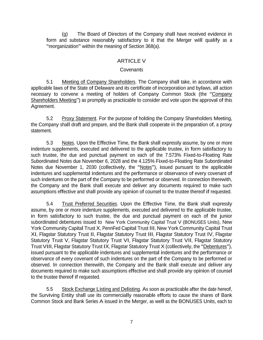 7 (g) The Board of Directors of the Company shall have received evidence in form and substance reasonably satisfactory to it that the Merger will qualify as a “reorganization” within the meaning of Section 368(a). ARTICLE V Covenants 5.1 Meeting of Company Shareholders. The Company shall take, in accordance with applicable laws of the State of Delaware and its certificate of incorporation and bylaws, all action necessary to convene a meeting of holders of Company Common Stock (the “Company Shareholders Meeting”) as promptly as practicable to consider and vote upon the approval of this Agreement. 5.2 Proxy Statement. For the purpose of holding the Company Shareholders Meeting, the Company shall draft and prepare, and the Bank shall cooperate in the preparation of, a proxy statement. 5.3 Notes. Upon the Effective Time, the Bank shall expressly assume, by one or more indenture supplements, executed and delivered to the applicable trustee, in form satisfactory to such trustee, the due and punctual payment on each of the 7.573% Fixed-to-Floating Rate Subordinated Notes due November 6, 2028 and the 4.125% Fixed-to-Floating Rate Subordinated Notes due November 1, 2030 (collectively, the “Notes”), issued pursuant to the applicable indentures and supplemental indentures and the performance or observance of every covenant of such indentures on the part of the Company to be performed or observed. In connection therewith, the Company and the Bank shall execute and deliver any documents required to make such assumptions effective and shall provide any opinion of counsel to the trustee thereof if requested. 5.4 Trust Preferred Securities. Upon the Effective Time, the Bank shall expressly assume, by one or more indenture supplements, executed and delivered to the applicable trustee, in form satisfactory to such trustee, the due and punctual payment on each of the junior subordinated debentures issued to New York Community Capital Trust V (BONUSES Units), New York Community Capital Trust X, PennFed Capital Trust III, New York Community Capital Trust XI, Flagstar Statutory Trust II, Flagstar Statutory Trust III, Flagstar Statutory Trust IV, Flagstar Statutory Trust V, Flagstar Statutory Trust VI, Flagstar Statutory Trust VII, Flagstar Statutory Trust VIII, Flagstar Statutory Trust IX, Flagstar Statutory Trust X (collectively, the “Debentures”), issued pursuant to the applicable indentures and supplemental indentures and the performance or observance of every covenant of such indentures on the part of the Company to be performed or observed. In connection therewith, the Company and the Bank shall execute and deliver any documents required to make such assumptions effective and shall provide any opinion of counsel to the trustee thereof if requested. 5.5 Stock Exchange Listing and Delisting. As soon as practicable after the date hereof, the Surviving Entity shall use its commercially reasonable efforts to cause the shares of Bank Common Stock and Bank Series A issued in the Merger, as well as the BONUSES Units, each to