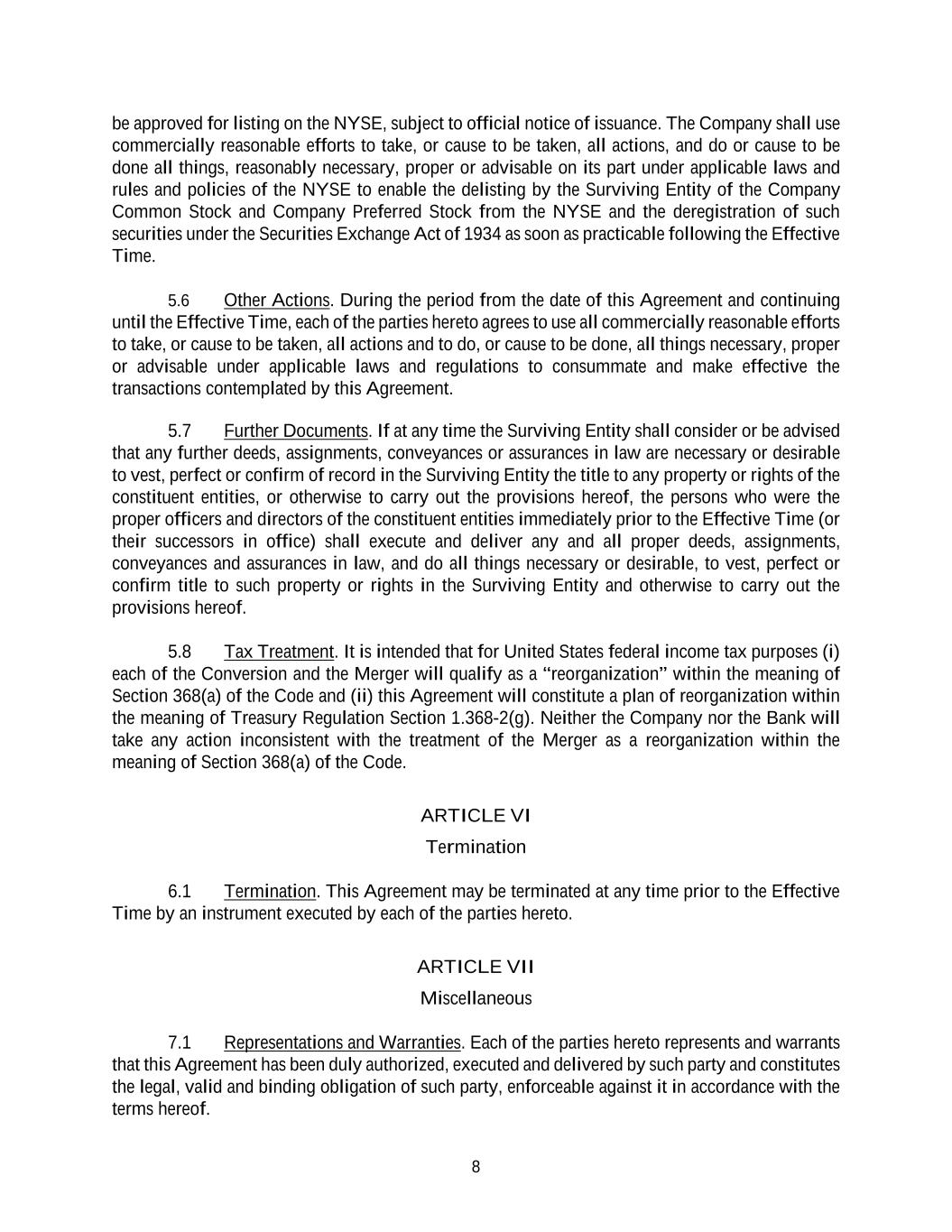 8 be approved for listing on the NYSE, subject to official notice of issuance. The Company shall use commercially reasonable efforts to take, or cause to be taken, all actions, and do or cause to be done all things, reasonably necessary, proper or advisable on its part under applicable laws and rules and policies of the NYSE to enable the delisting by the Surviving Entity of the Company Common Stock and Company Preferred Stock from the NYSE and the deregistration of such securities under the Securities Exchange Act of 1934 as soon as practicable following the Effective Time. 5.6 Other Actions. During the period from the date of this Agreement and continuing until the Effective Time, each of the parties hereto agrees to use all commercially reasonable efforts to take, or cause to be taken, all actions and to do, or cause to be done, all things necessary, proper or advisable under applicable laws and regulations to consummate and make effective the transactions contemplated by this Agreement. 5.7 Further Documents. If at any time the Surviving Entity shall consider or be advised that any further deeds, assignments, conveyances or assurances in law are necessary or desirable to vest, perfect or confirm of record in the Surviving Entity the title to any property or rights of the constituent entities, or otherwise to carry out the provisions hereof, the persons who were the proper officers and directors of the constituent entities immediately prior to the Effective Time (or their successors in office) shall execute and deliver any and all proper deeds, assignments, conveyances and assurances in law, and do all things necessary or desirable, to vest, perfect or confirm title to such property or rights in the Surviving Entity and otherwise to carry out the provisions hereof. 5.8 Tax Treatment. It is intended that for United States federal income tax purposes (i) each of the Conversion and the Merger will qualify as a “reorganization” within the meaning of Section 368(a) of the Code and (ii) this Agreement will constitute a plan of reorganization within the meaning of Treasury Regulation Section 1.368-2(g). Neither the Company nor the Bank will take any action inconsistent with the treatment of the Merger as a reorganization within the meaning of Section 368(a) of the Code. ARTICLE VI Termination 6.1 Termination. This Agreement may be terminated at any time prior to the Effective Time by an instrument executed by each of the parties hereto. ARTICLE VII Miscellaneous 7.1 Representations and Warranties. Each of the parties hereto represents and warrants that this Agreement has been duly authorized, executed and delivered by such party and constitutes the legal, valid and binding obligation of such party, enforceable against it in accordance with the terms hereof.