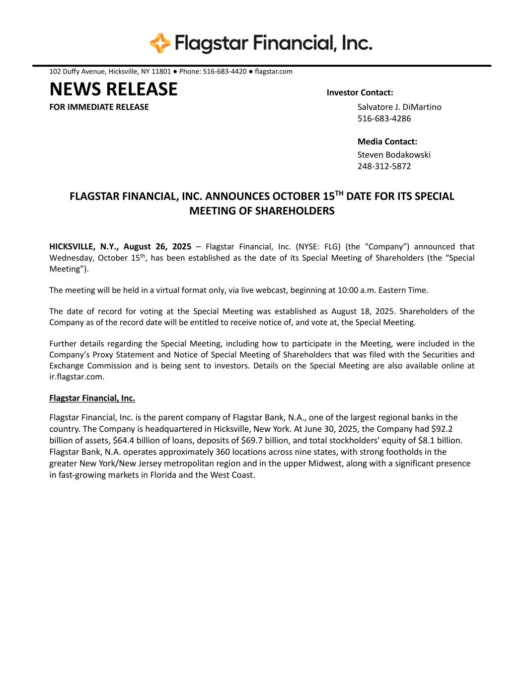 102 Duffy Avenue, Hicksville, NY 11801 ● Phone: 516-683-4420 ● flagstar.com NEWS RELEASE Investor Contact: FOR IMMEDIATE RELEASE Salvatore J. DiMartino 516-683-4286 Media Contact: Steven Bodakowski 248-312-5872 FLAGSTAR FINANCIAL, INC. ANNOUNCES OCTOBER 15TH DATE FOR ITS SPECIAL MEETING OF SHAREHOLDERS HICKSVILLE, N.Y., August 26, 2025 – Flagstar Financial, Inc. (NYSE: FLG) (the "Company”) announced that Wednesday, October 15th, has been established as the date of its Special Meeting of Shareholders (the “Special Meeting”). The meeting will be held in a virtual format only, via live webcast, beginning at 10:00 a.m. Eastern Time. The date of record for voting at the Special Meeting was established as August 18, 2025. Shareholders of the Company as of the record date will be entitled to receive notice of, and vote at, the Special Meeting. Further details regarding the Special Meeting, including how to participate in the Meeting, were included in the Company’s Proxy Statement and Notice of Special Meeting of Shareholders that was filed with the Securities and Exchange Commission and is being sent to investors. Details on the Special Meeting are also available online at ir.flagstar.com. Flagstar Financial, Inc. Flagstar Financial, Inc. is the parent company of Flagstar Bank, N.A., one of the largest regional banks in the country. The Company is headquartered in Hicksville, New York. At June 30, 2025, the Company had $92.2 billion of assets, $64.4 billion of loans, deposits of $69.7 billion, and total stockholders' equity of $8.1 billion. Flagstar Bank, N.A. operates approximately 360 locations across nine states, with strong footholds in the greater New York/New Jersey metropolitan region and in the upper Midwest, along with a significant presence in fast-growing markets in Florida and the West Coast.