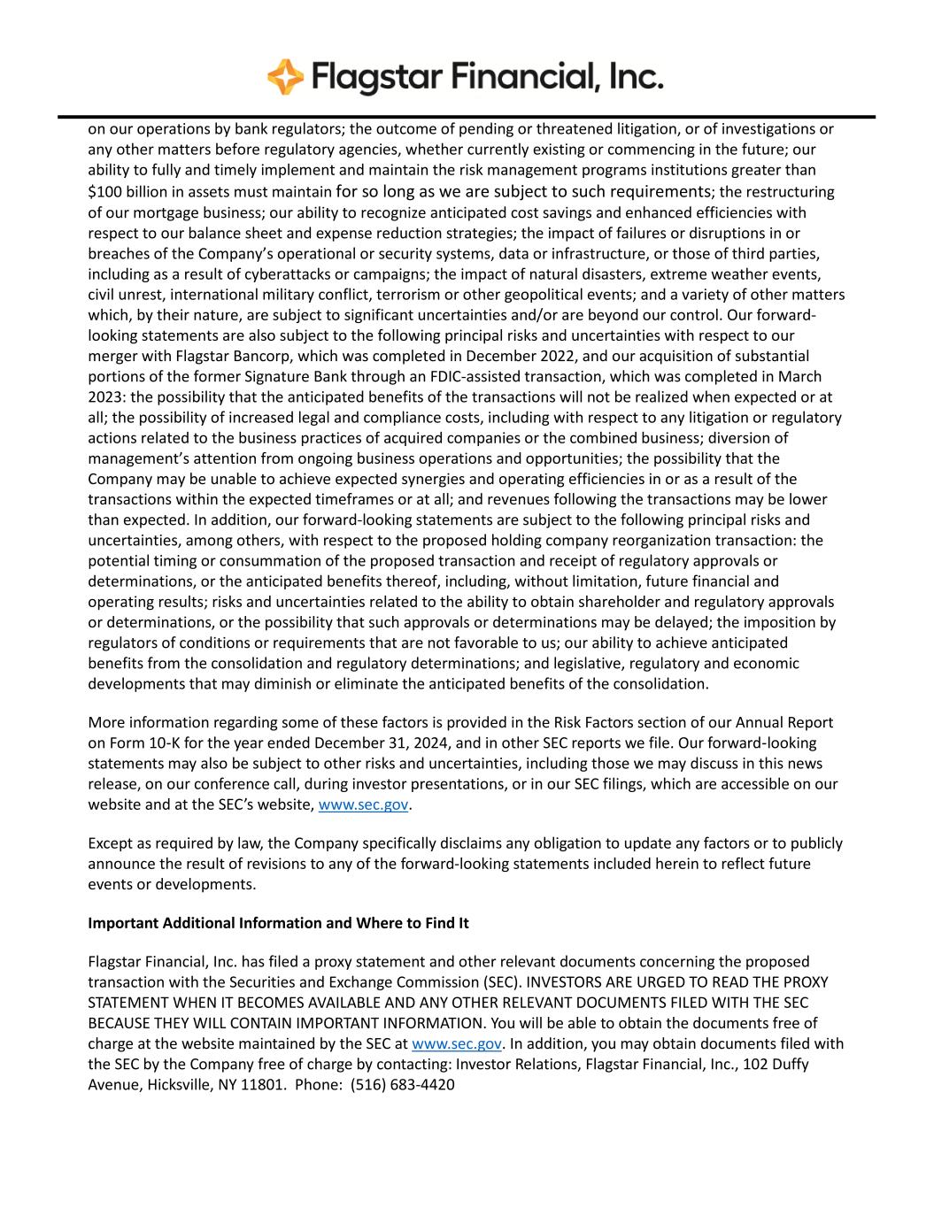 on our operations by bank regulators; the outcome of pending or threatened litigation, or of investigations or any other matters before regulatory agencies, whether currently existing or commencing in the future; our ability to fully and timely implement and maintain the risk management programs institutions greater than $100 billion in assets must maintain for so long as we are subject to such requirements; the restructuring of our mortgage business; our ability to recognize anticipated cost savings and enhanced efficiencies with respect to our balance sheet and expense reduction strategies; the impact of failures or disruptions in or breaches of the Company’s operational or security systems, data or infrastructure, or those of third parties, including as a result of cyberattacks or campaigns; the impact of natural disasters, extreme weather events, civil unrest, international military conflict, terrorism or other geopolitical events; and a variety of other matters which, by their nature, are subject to significant uncertainties and/or are beyond our control. Our forward- looking statements are also subject to the following principal risks and uncertainties with respect to our merger with Flagstar Bancorp, which was completed in December 2022, and our acquisition of substantial portions of the former Signature Bank through an FDIC-assisted transaction, which was completed in March 2023: the possibility that the anticipated benefits of the transactions will not be realized when expected or at all; the possibility of increased legal and compliance costs, including with respect to any litigation or regulatory actions related to the business practices of acquired companies or the combined business; diversion of management’s attention from ongoing business operations and opportunities; the possibility that the Company may be unable to achieve expected synergies and operating efficiencies in or as a result of the transactions within the expected timeframes or at all; and revenues following the transactions may be lower than expected. In addition, our forward-looking statements are subject to the following principal risks and uncertainties, among others, with respect to the proposed holding company reorganization transaction: the potential timing or consummation of the proposed transaction and receipt of regulatory approvals or determinations, or the anticipated benefits thereof, including, without limitation, future financial and operating results; risks and uncertainties related to the ability to obtain shareholder and regulatory approvals or determinations, or the possibility that such approvals or determinations may be delayed; the imposition by regulators of conditions or requirements that are not favorable to us; our ability to achieve anticipated benefits from the consolidation and regulatory determinations; and legislative, regulatory and economic developments that may diminish or eliminate the anticipated benefits of the consolidation. More information regarding some of these factors is provided in the Risk Factors section of our Annual Report on Form 10‐K for the year ended December 31, 2024, and in other SEC reports we file. Our forward‐looking statements may also be subject to other risks and uncertainties, including those we may discuss in this news release, on our conference call, during investor presentations, or in our SEC filings, which are accessible on our website and at the SEC’s website, www.sec.gov. Except as required by law, the Company specifically disclaims any obligation to update any factors or to publicly announce the result of revisions to any of the forward-looking statements included herein to reflect future events or developments. Important Additional Information and Where to Find It Flagstar Financial, Inc. has filed a proxy statement and other relevant documents concerning the proposed transaction with the Securities and Exchange Commission (SEC). INVESTORS ARE URGED TO READ THE PROXY STATEMENT WHEN IT BECOMES AVAILABLE AND ANY OTHER RELEVANT DOCUMENTS FILED WITH THE SEC BECAUSE THEY WILL CONTAIN IMPORTANT INFORMATION. You will be able to obtain the documents free of charge at the website maintained by the SEC at www.sec.gov. In addition, you may obtain documents filed with the SEC by the Company free of charge by contacting: Investor Relations, Flagstar Financial, Inc., 102 Duffy Avenue, Hicksville, NY 11801. Phone: (516) 683-4420