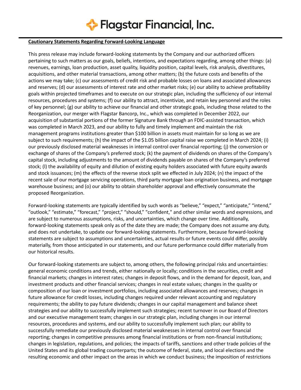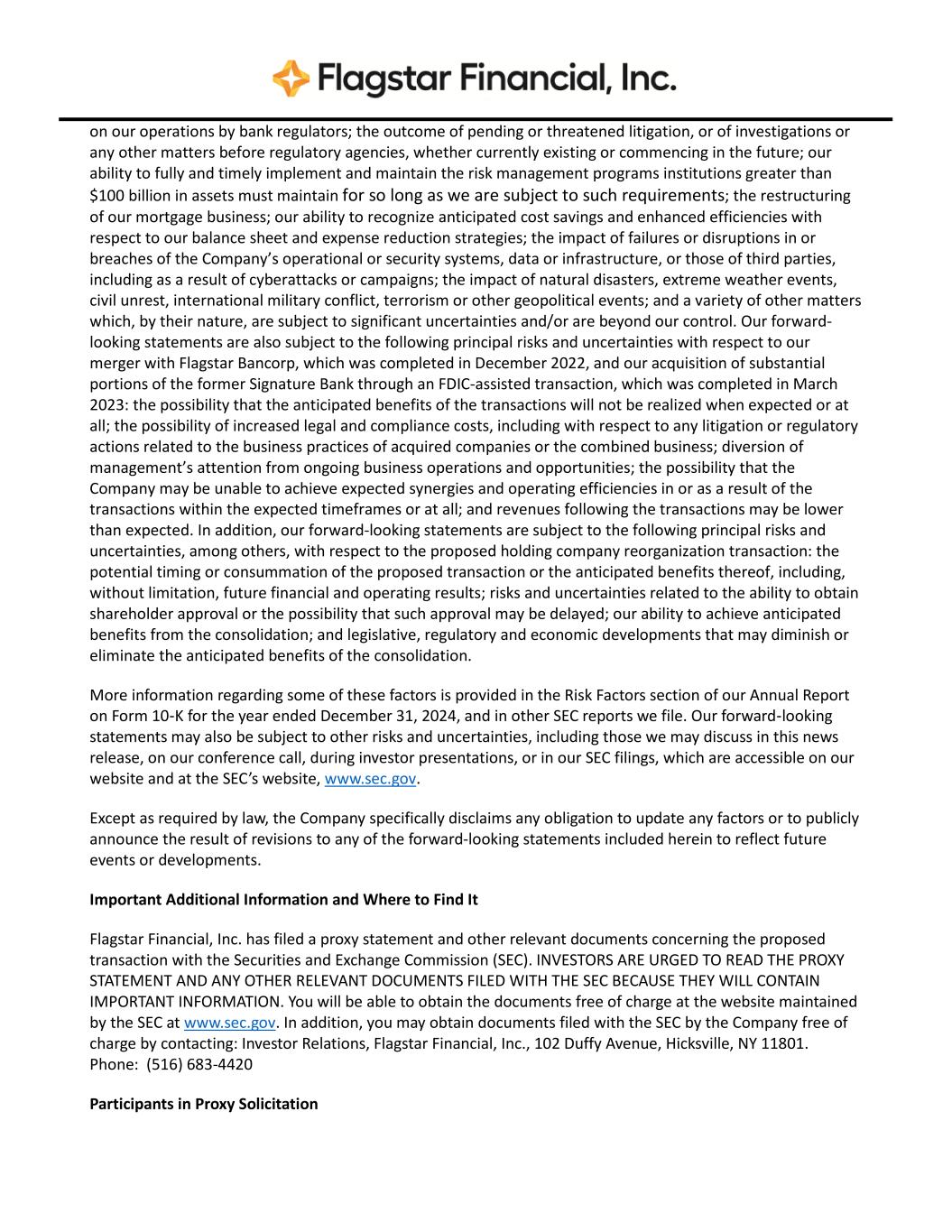 on our operations by bank regulators; the outcome of pending or threatened litigation, or of investigations or any other matters before regulatory agencies, whether currently existing or commencing in the future; our ability to fully and timely implement and maintain the risk management programs institutions greater than $100 billion in assets must maintain for so long as we are subject to such requirements; the restructuring of our mortgage business; our ability to recognize anticipated cost savings and enhanced efficiencies with respect to our balance sheet and expense reduction strategies; the impact of failures or disruptions in or breaches of the Company’s operational or security systems, data or infrastructure, or those of third parties, including as a result of cyberattacks or campaigns; the impact of natural disasters, extreme weather events, civil unrest, international military conflict, terrorism or other geopolitical events; and a variety of other matters which, by their nature, are subject to significant uncertainties and/or are beyond our control. Our forward- looking statements are also subject to the following principal risks and uncertainties with respect to our merger with Flagstar Bancorp, which was completed in December 2022, and our acquisition of substantial portions of the former Signature Bank through an FDIC-assisted transaction, which was completed in March 2023: the possibility that the anticipated benefits of the transactions will not be realized when expected or at all; the possibility of increased legal and compliance costs, including with respect to any litigation or regulatory actions related to the business practices of acquired companies or the combined business; diversion of management’s attention from ongoing business operations and opportunities; the possibility that the Company may be unable to achieve expected synergies and operating efficiencies in or as a result of the transactions within the expected timeframes or at all; and revenues following the transactions may be lower than expected. In addition, our forward-looking statements are subject to the following principal risks and uncertainties, among others, with respect to the proposed holding company reorganization transaction: the potential timing or consummation of the proposed transaction or the anticipated benefits thereof, including, without limitation, future financial and operating results; risks and uncertainties related to the ability to obtain shareholder approval or the possibility that such approval may be delayed; our ability to achieve anticipated benefits from the consolidation; and legislative, regulatory and economic developments that may diminish or eliminate the anticipated benefits of the consolidation. More information regarding some of these factors is provided in the Risk Factors section of our Annual Report on Form 10‐K for the year ended December 31, 2024, and in other SEC reports we file. Our forward‐looking statements may also be subject to other risks and uncertainties, including those we may discuss in this news release, on our conference call, during investor presentations, or in our SEC filings, which are accessible on our website and at the SEC’s website, www.sec.gov. Except as required by law, the Company specifically disclaims any obligation to update any factors or to publicly announce the result of revisions to any of the forward-looking statements included herein to reflect future events or developments. Important Additional Information and Where to Find It Flagstar Financial, Inc. has filed a proxy statement and other relevant documents concerning the proposed transaction with the Securities and Exchange Commission (SEC). INVESTORS ARE URGED TO READ THE PROXY STATEMENT AND ANY OTHER RELEVANT DOCUMENTS FILED WITH THE SEC BECAUSE THEY WILL CONTAIN IMPORTANT INFORMATION. You will be able to obtain the documents free of charge at the website maintained by the SEC at www.sec.gov. In addition, you may obtain documents filed with the SEC by the Company free of charge by contacting: Investor Relations, Flagstar Financial, Inc., 102 Duffy Avenue, Hicksville, NY 11801. Phone: (516) 683-4420 Participants in Proxy Solicitation