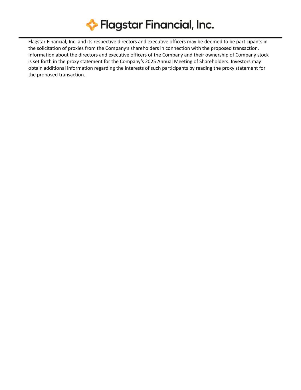 Flagstar Financial, Inc. and its respective directors and executive officers may be deemed to be participants in the solicitation of proxies from the Company’s shareholders in connection with the proposed transaction. Information about the directors and executive officers of the Company and their ownership of Company stock is set forth in the proxy statement for the Company’s 2025 Annual Meeting of Shareholders. Investors may obtain additional information regarding the interests of such participants by reading the proxy statement for the proposed transaction.