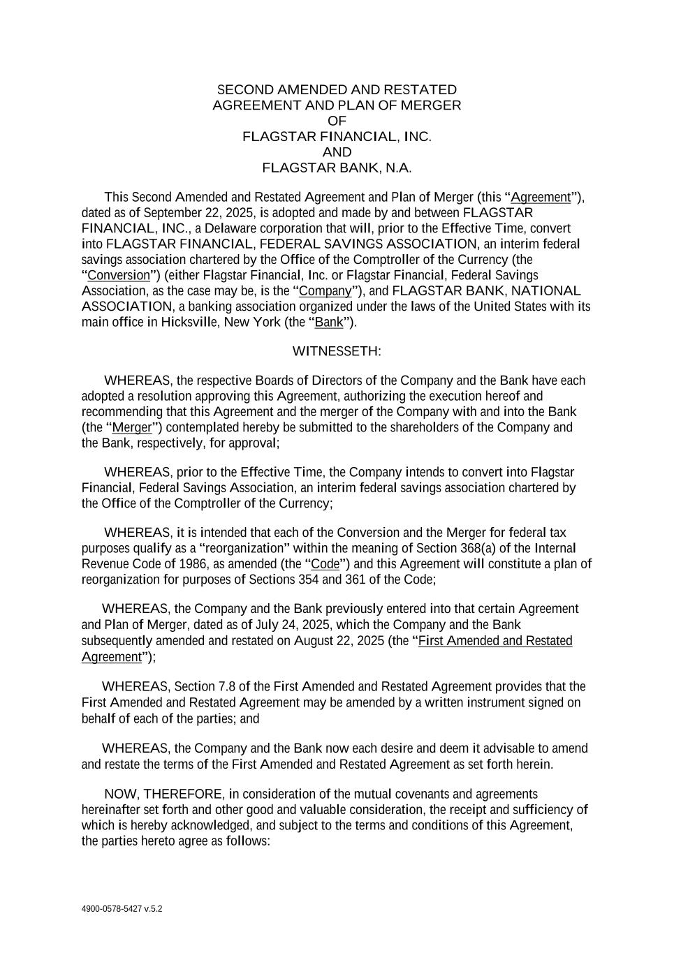 4900-0578-5427 v.5.2 SECOND AMENDED AND RESTATED AGREEMENT AND PLAN OF MERGER OF FLAGSTAR FINANCIAL, INC. AND FLAGSTAR BANK, N.A. This Second Amended and Restated Agreement and Plan of Merger (this “Agreement”), dated as of September 22, 2025, is adopted and made by and between FLAGSTAR FINANCIAL, INC., a Delaware corporation that will, prior to the Effective Time, convert into FLAGSTAR FINANCIAL, FEDERAL SAVINGS ASSOCIATION, an interim federal savings association chartered by the Office of the Comptroller of the Currency (the “Conversion”) (either Flagstar Financial, Inc. or Flagstar Financial, Federal Savings Association, as the case may be, is the “Company”), and FLAGSTAR BANK, NATIONAL ASSOCIATION, a banking association organized under the laws of the United States with its main office in Hicksville, New York (the “Bank”). WITNESSETH: WHEREAS, the respective Boards of Directors of the Company and the Bank have each adopted a resolution approving this Agreement, authorizing the execution hereof and recommending that this Agreement and the merger of the Company with and into the Bank (the “Merger”) contemplated hereby be submitted to the shareholders of the Company and the Bank, respectively, for approval; WHEREAS, prior to the Effective Time, the Company intends to convert into Flagstar Financial, Federal Savings Association, an interim federal savings association chartered by the Office of the Comptroller of the Currency; WHEREAS, it is intended that each of the Conversion and the Merger for federal tax purposes qualify as a “reorganization” within the meaning of Section 368(a) of the Internal Revenue Code of 1986, as amended (the “Code”) and this Agreement will constitute a plan of reorganization for purposes of Sections 354 and 361 of the Code; WHEREAS, the Company and the Bank previously entered into that certain Agreement and Plan of Merger, dated as of July 24, 2025, which the Company and the Bank subsequently amended and restated on August 22, 2025 (the “First Amended and Restated Agreement”); WHEREAS, Section 7.8 of the First Amended and Restated Agreement provides that the First Amended and Restated Agreement may be amended by a written instrument signed on behalf of each of the parties; and WHEREAS, the Company and the Bank now each desire and deem it advisable to amend and restate the terms of the First Amended and Restated Agreement as set forth herein. NOW, THEREFORE, in consideration of the mutual covenants and agreements hereinafter set forth and other good and valuable consideration, the receipt and sufficiency of which is hereby acknowledged, and subject to the terms and conditions of this Agreement, the parties hereto agree as follows: