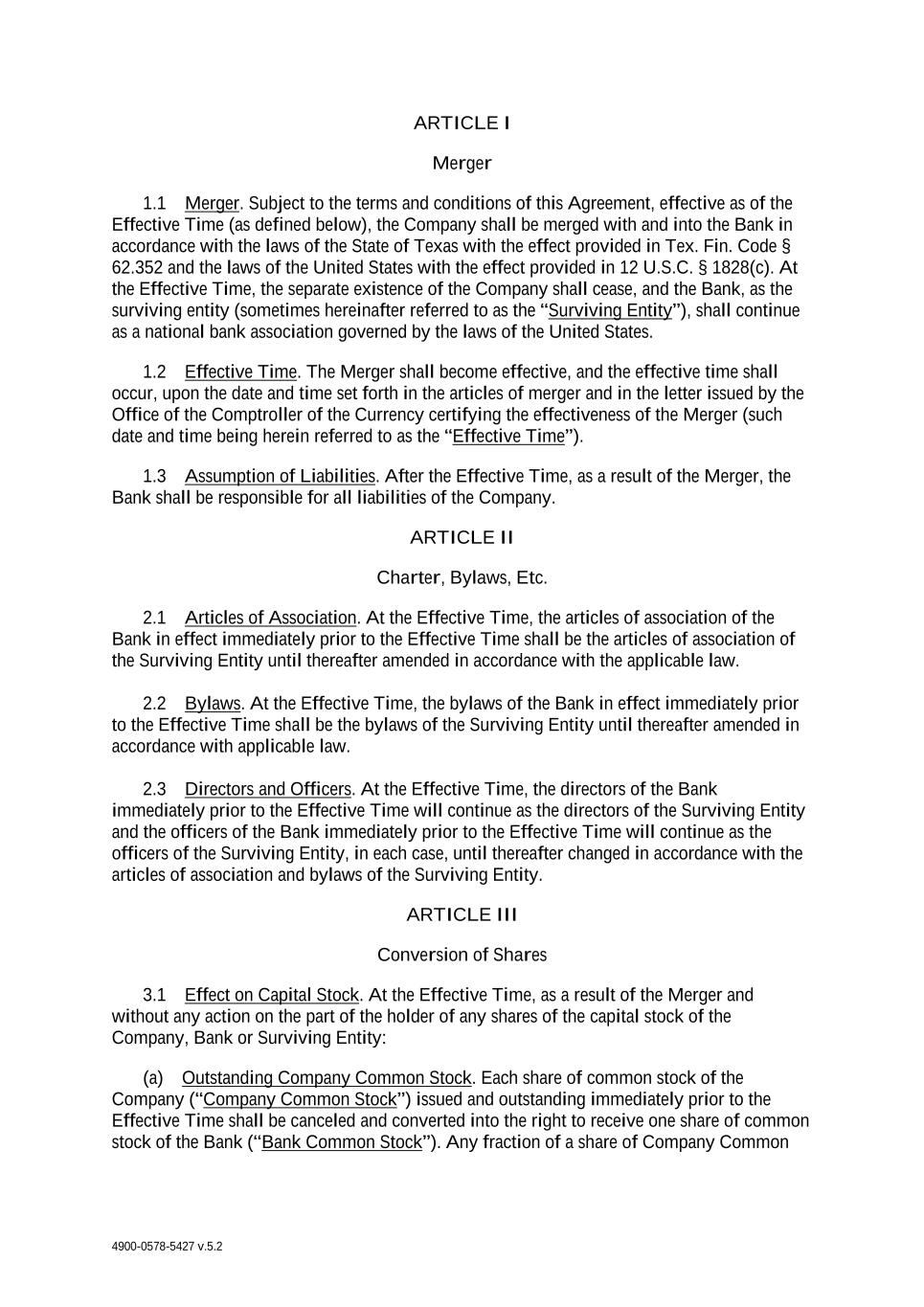 4900-0578-5427 v.5.2 ARTICLE I Merger 1.1 Merger. Subject to the terms and conditions of this Agreement, effective as of the Effective Time (as defined below), the Company shall be merged with and into the Bank in accordance with the laws of the State of Texas with the effect provided in Tex. Fin. Code § 62.352 and the laws of the United States with the effect provided in 12 U.S.C. § 1828(c). At the Effective Time, the separate existence of the Company shall cease, and the Bank, as the surviving entity (sometimes hereinafter referred to as the “Surviving Entity”), shall continue as a national bank association governed by the laws of the United States. 1.2 Effective Time. The Merger shall become effective, and the effective time shall occur, upon the date and time set forth in the articles of merger and in the letter issued by the Office of the Comptroller of the Currency certifying the effectiveness of the Merger (such date and time being herein referred to as the “Effective Time”). 1.3 Assumption of Liabilities. After the Effective Time, as a result of the Merger, the Bank shall be responsible for all liabilities of the Company. ARTICLE II Charter, Bylaws, Etc. 2.1 Articles of Association. At the Effective Time, the articles of association of the Bank in effect immediately prior to the Effective Time shall be the articles of association of the Surviving Entity until thereafter amended in accordance with the applicable law. 2.2 Bylaws. At the Effective Time, the bylaws of the Bank in effect immediately prior to the Effective Time shall be the bylaws of the Surviving Entity until thereafter amended in accordance with applicable law. 2.3 Directors and Officers. At the Effective Time, the directors of the Bank immediately prior to the Effective Time will continue as the directors of the Surviving Entity and the officers of the Bank immediately prior to the Effective Time will continue as the officers of the Surviving Entity, in each case, until thereafter changed in accordance with the articles of association and bylaws of the Surviving Entity. ARTICLE III Conversion of Shares 3.1 Effect on Capital Stock. At the Effective Time, as a result of the Merger and without any action on the part of the holder of any shares of the capital stock of the Company, Bank or Surviving Entity: (a) Outstanding Company Common Stock. Each share of common stock of the Company (“Company Common Stock”) issued and outstanding immediately prior to the Effective Time shall be canceled and converted into the right to receive one share of common stock of the Bank (“Bank Common Stock”). Any fraction of a share of Company Common