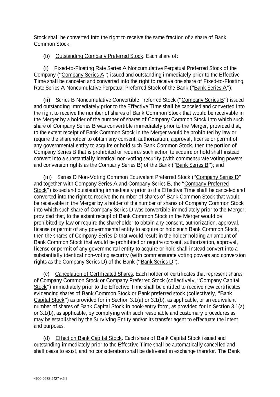 4900-0578-5427 v.5.2 Stock shall be converted into the right to receive the same fraction of a share of Bank Common Stock. (b) Outstanding Company Preferred Stock. Each share of: (i) Fixed-to-Floating Rate Series A Noncumulative Perpetual Preferred Stock of the Company (“Company Series A”) issued and outstanding immediately prior to the Effective Time shall be canceled and converted into the right to receive one share of Fixed-to-Floating Rate Series A Noncumulative Perpetual Preferred Stock of the Bank (“Bank Series A”); (ii) Series B Noncumulative Convertible Preferred Stock (“Company Series B”) issued and outstanding immediately prior to the Effective Time shall be canceled and converted into the right to receive the number of shares of Bank Common Stock that would be receivable in the Merger by a holder of the number of shares of Company Common Stock into which such share of Company Series B was convertible immediately prior to the Merger; provided that, to the extent receipt of Bank Common Stock in the Merger would be prohibited by law or require the shareholder to obtain any consent, authorization, approval, license or permit of any governmental entity to acquire or hold such Bank Common Stock, then the portion of Company Series B that is prohibited or requires such action to acquire or hold shall instead convert into a substantially identical non-voting security (with commensurate voting powers and conversion rights as the Company Series B) of the Bank (“Bank Series B”); and (iii) Series D Non-Voting Common Equivalent Preferred Stock (“Company Series D” and together with Company Series A and Company Series B, the “Company Preferred Stock”) issued and outstanding immediately prior to the Effective Time shall be canceled and converted into the right to receive the number of shares of Bank Common Stock that would be receivable in the Merger by a holder of the number of shares of Company Common Stock into which such share of Company Series D was convertible immediately prior to the Merger; provided that, to the extent receipt of Bank Common Stock in the Merger would be prohibited by law or require the shareholder to obtain any consent, authorization, approval, license or permit of any governmental entity to acquire or hold such Bank Common Stock, then the shares of Company Series D that would result in the holder holding an amount of Bank Common Stock that would be prohibited or require consent, authorization, approval, license or permit of any governmental entity to acquire or hold shall instead convert into a substantially identical non-voting security (with commensurate voting powers and conversion rights as the Company Series D) of the Bank (“Bank Series D”). (c) Cancelation of Certificated Shares. Each holder of certificates that represent shares of Company Common Stock or Company Preferred Stock (collectively, “Company Capital Stock”) immediately prior to the Effective Time shall be entitled to receive new certificates evidencing shares of Bank Common Stock or Bank preferred stock (collectively, “Bank Capital Stock”) as provided for in Section 3.1(a) or 3.1(b), as applicable, or an equivalent number of shares of Bank Capital Stock in book-entry form, as provided for in Section 3.1(a) or 3.1(b), as applicable, by complying with such reasonable and customary procedures as may be established by the Surviving Entity and/or its transfer agent to effectuate the intent and purposes. (d) Effect on Bank Capital Stock. Each share of Bank Capital Stock issued and outstanding immediately prior to the Effective Time shall be automatically cancelled and shall cease to exist, and no consideration shall be delivered in exchange therefor. The Bank