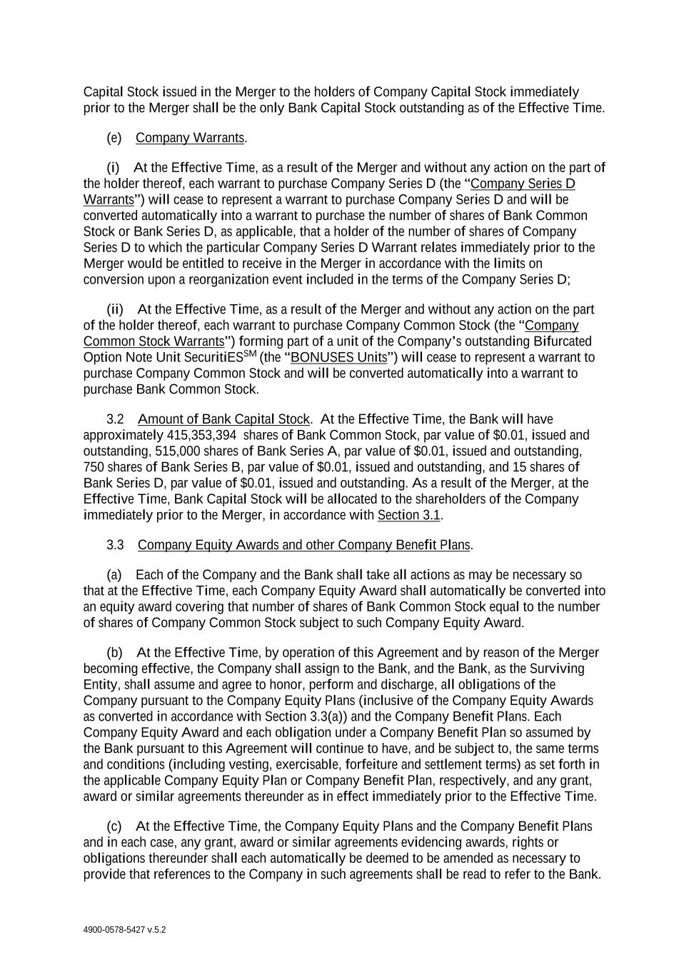 4900-0578-5427 v.5.2 Capital Stock issued in the Merger to the holders of Company Capital Stock immediately prior to the Merger shall be the only Bank Capital Stock outstanding as of the Effective Time. (e) Company Warrants. (i) At the Effective Time, as a result of the Merger and without any action on the part of the holder thereof, each warrant to purchase Company Series D (the “Company Series D Warrants”) will cease to represent a warrant to purchase Company Series D and will be converted automatically into a warrant to purchase the number of shares of Bank Common Stock or Bank Series D, as applicable, that a holder of the number of shares of Company Series D to which the particular Company Series D Warrant relates immediately prior to the Merger would be entitled to receive in the Merger in accordance with the limits on conversion upon a reorganization event included in the terms of the Company Series D; (ii) At the Effective Time, as a result of the Merger and without any action on the part of the holder thereof, each warrant to purchase Company Common Stock (the “Company Common Stock Warrants”) forming part of a unit of the Company’s outstanding Bifurcated Option Note Unit SecuritiESSM (the “BONUSES Units”) will cease to represent a warrant to purchase Company Common Stock and will be converted automatically into a warrant to purchase Bank Common Stock. 3.2 Amount of Bank Capital Stock. At the Effective Time, the Bank will have approximately 415,353,394 shares of Bank Common Stock, par value of $0.01, issued and outstanding, 515,000 shares of Bank Series A, par value of $0.01, issued and outstanding, 750 shares of Bank Series B, par value of $0.01, issued and outstanding, and 15 shares of Bank Series D, par value of $0.01, issued and outstanding. As a result of the Merger, at the Effective Time, Bank Capital Stock will be allocated to the shareholders of the Company immediately prior to the Merger, in accordance with Section 3.1. 3.3 Company Equity Awards and other Company Benefit Plans. (a) Each of the Company and the Bank shall take all actions as may be necessary so that at the Effective Time, each Company Equity Award shall automatically be converted into an equity award covering that number of shares of Bank Common Stock equal to the number of shares of Company Common Stock subject to such Company Equity Award. (b) At the Effective Time, by operation of this Agreement and by reason of the Merger becoming effective, the Company shall assign to the Bank, and the Bank, as the Surviving Entity, shall assume and agree to honor, perform and discharge, all obligations of the Company pursuant to the Company Equity Plans (inclusive of the Company Equity Awards as converted in accordance with Section 3.3(a)) and the Company Benefit Plans. Each Company Equity Award and each obligation under a Company Benefit Plan so assumed by the Bank pursuant to this Agreement will continue to have, and be subject to, the same terms and conditions (including vesting, exercisable, forfeiture and settlement terms) as set forth in the applicable Company Equity Plan or Company Benefit Plan, respectively, and any grant, award or similar agreements thereunder as in effect immediately prior to the Effective Time. (c) At the Effective Time, the Company Equity Plans and the Company Benefit Plans and in each case, any grant, award or similar agreements evidencing awards, rights or obligations thereunder shall each automatically be deemed to be amended as necessary to provide that references to the Company in such agreements shall be read to refer to the Bank.