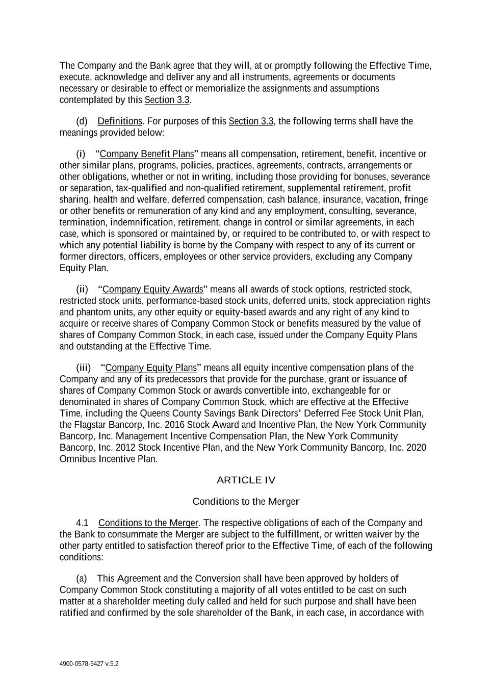 4900-0578-5427 v.5.2 The Company and the Bank agree that they will, at or promptly following the Effective Time, execute, acknowledge and deliver any and all instruments, agreements or documents necessary or desirable to effect or memorialize the assignments and assumptions contemplated by this Section 3.3. (d) Definitions. For purposes of this Section 3.3, the following terms shall have the meanings provided below: (i) “Company Benefit Plans” means all compensation, retirement, benefit, incentive or other similar plans, programs, policies, practices, agreements, contracts, arrangements or other obligations, whether or not in writing, including those providing for bonuses, severance or separation, tax-qualified and non-qualified retirement, supplemental retirement, profit sharing, health and welfare, deferred compensation, cash balance, insurance, vacation, fringe or other benefits or remuneration of any kind and any employment, consulting, severance, termination, indemnification, retirement, change in control or similar agreements, in each case, which is sponsored or maintained by, or required to be contributed to, or with respect to which any potential liability is borne by the Company with respect to any of its current or former directors, officers, employees or other service providers, excluding any Company Equity Plan. (ii) “Company Equity Awards” means all awards of stock options, restricted stock, restricted stock units, performance-based stock units, deferred units, stock appreciation rights and phantom units, any other equity or equity-based awards and any right of any kind to acquire or receive shares of Company Common Stock or benefits measured by the value of shares of Company Common Stock, in each case, issued under the Company Equity Plans and outstanding at the Effective Time. (iii) “Company Equity Plans” means all equity incentive compensation plans of the Company and any of its predecessors that provide for the purchase, grant or issuance of shares of Company Common Stock or awards convertible into, exchangeable for or denominated in shares of Company Common Stock, which are effective at the Effective Time, including the Queens County Savings Bank Directors’ Deferred Fee Stock Unit Plan, the Flagstar Bancorp, Inc. 2016 Stock Award and Incentive Plan, the New York Community Bancorp, Inc. Management Incentive Compensation Plan, the New York Community Bancorp, Inc. 2012 Stock Incentive Plan, and the New York Community Bancorp, Inc. 2020 Omnibus Incentive Plan. ARTICLE IV Conditions to the Merger 4.1 Conditions to the Merger. The respective obligations of each of the Company and the Bank to consummate the Merger are subject to the fulfillment, or written waiver by the other party entitled to satisfaction thereof prior to the Effective Time, of each of the following conditions: (a) This Agreement and the Conversion shall have been approved by holders of Company Common Stock constituting a majority of all votes entitled to be cast on such matter at a shareholder meeting duly called and held for such purpose and shall have been ratified and confirmed by the sole shareholder of the Bank, in each case, in accordance with