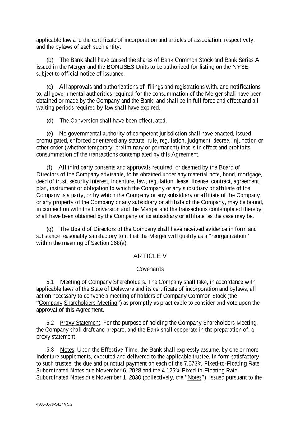 4900-0578-5427 v.5.2 applicable law and the certificate of incorporation and articles of association, respectively, and the bylaws of each such entity. (b) The Bank shall have caused the shares of Bank Common Stock and Bank Series A issued in the Merger and the BONUSES Units to be authorized for listing on the NYSE, subject to official notice of issuance. (c) All approvals and authorizations of, filings and registrations with, and notifications to, all governmental authorities required for the consummation of the Merger shall have been obtained or made by the Company and the Bank, and shall be in full force and effect and all waiting periods required by law shall have expired. (d) The Conversion shall have been effectuated. (e) No governmental authority of competent jurisdiction shall have enacted, issued, promulgated, enforced or entered any statute, rule, regulation, judgment, decree, injunction or other order (whether temporary, preliminary or permanent) that is in effect and prohibits consummation of the transactions contemplated by this Agreement. (f) All third party consents and approvals required, or deemed by the Board of Directors of the Company advisable, to be obtained under any material note, bond, mortgage, deed of trust, security interest, indenture, law, regulation, lease, license, contract, agreement, plan, instrument or obligation to which the Company or any subsidiary or affiliate of the Company is a party, or by which the Company or any subsidiary or affiliate of the Company, or any property of the Company or any subsidiary or affiliate of the Company, may be bound, in connection with the Conversion and the Merger and the transactions contemplated thereby, shall have been obtained by the Company or its subsidiary or affiliate, as the case may be. (g) The Board of Directors of the Company shall have received evidence in form and substance reasonably satisfactory to it that the Merger will qualify as a “reorganization” within the meaning of Section 368(a). ARTICLE V Covenants 5.1 Meeting of Company Shareholders. The Company shall take, in accordance with applicable laws of the State of Delaware and its certificate of incorporation and bylaws, all action necessary to convene a meeting of holders of Company Common Stock (the “Company Shareholders Meeting”) as promptly as practicable to consider and vote upon the approval of this Agreement. 5.2 Proxy Statement. For the purpose of holding the Company Shareholders Meeting, the Company shall draft and prepare, and the Bank shall cooperate in the preparation of, a proxy statement. 5.3 Notes. Upon the Effective Time, the Bank shall expressly assume, by one or more indenture supplements, executed and delivered to the applicable trustee, in form satisfactory to such trustee, the due and punctual payment on each of the 7.573% Fixed-to-Floating Rate Subordinated Notes due November 6, 2028 and the 4.125% Fixed-to-Floating Rate Subordinated Notes due November 1, 2030 (collectively, the “Notes”), issued pursuant to the
