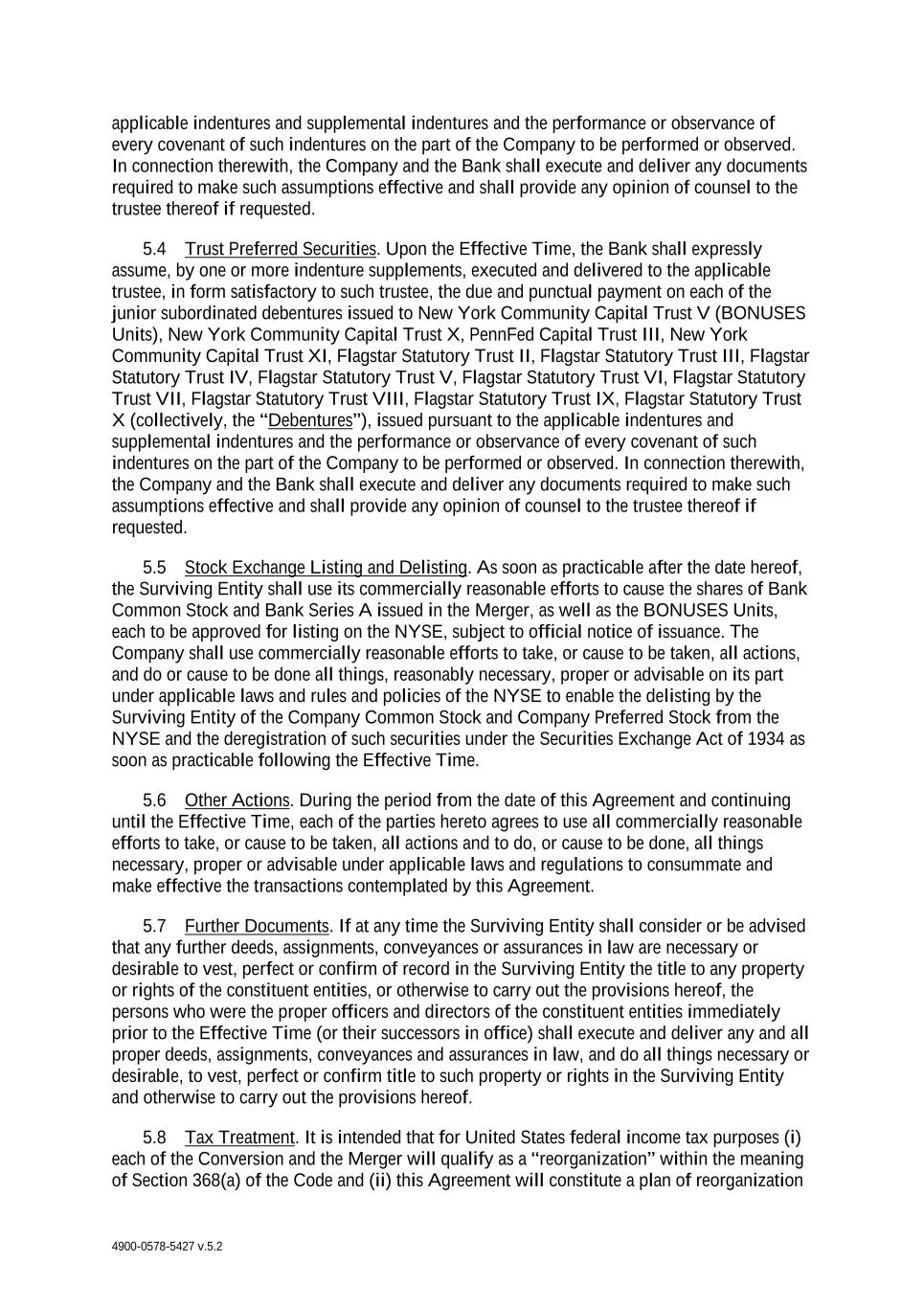 4900-0578-5427 v.5.2 applicable indentures and supplemental indentures and the performance or observance of every covenant of such indentures on the part of the Company to be performed or observed. In connection therewith, the Company and the Bank shall execute and deliver any documents required to make such assumptions effective and shall provide any opinion of counsel to the trustee thereof if requested. 5.4 Trust Preferred Securities. Upon the Effective Time, the Bank shall expressly assume, by one or more indenture supplements, executed and delivered to the applicable trustee, in form satisfactory to such trustee, the due and punctual payment on each of the junior subordinated debentures issued to New York Community Capital Trust V (BONUSES Units), New York Community Capital Trust X, PennFed Capital Trust III, New York Community Capital Trust XI, Flagstar Statutory Trust II, Flagstar Statutory Trust III, Flagstar Statutory Trust IV, Flagstar Statutory Trust V, Flagstar Statutory Trust VI, Flagstar Statutory Trust VII, Flagstar Statutory Trust VIII, Flagstar Statutory Trust IX, Flagstar Statutory Trust X (collectively, the “Debentures”), issued pursuant to the applicable indentures and supplemental indentures and the performance or observance of every covenant of such indentures on the part of the Company to be performed or observed. In connection therewith, the Company and the Bank shall execute and deliver any documents required to make such assumptions effective and shall provide any opinion of counsel to the trustee thereof if requested. 5.5 Stock Exchange Listing and Delisting. As soon as practicable after the date hereof, the Surviving Entity shall use its commercially reasonable efforts to cause the shares of Bank Common Stock and Bank Series A issued in the Merger, as well as the BONUSES Units, each to be approved for listing on the NYSE, subject to official notice of issuance. The Company shall use commercially reasonable efforts to take, or cause to be taken, all actions, and do or cause to be done all things, reasonably necessary, proper or advisable on its part under applicable laws and rules and policies of the NYSE to enable the delisting by the Surviving Entity of the Company Common Stock and Company Preferred Stock from the NYSE and the deregistration of such securities under the Securities Exchange Act of 1934 as soon as practicable following the Effective Time. 5.6 Other Actions. During the period from the date of this Agreement and continuing until the Effective Time, each of the parties hereto agrees to use all commercially reasonable efforts to take, or cause to be taken, all actions and to do, or cause to be done, all things necessary, proper or advisable under applicable laws and regulations to consummate and make effective the transactions contemplated by this Agreement. 5.7 Further Documents. If at any time the Surviving Entity shall consider or be advised that any further deeds, assignments, conveyances or assurances in law are necessary or desirable to vest, perfect or confirm of record in the Surviving Entity the title to any property or rights of the constituent entities, or otherwise to carry out the provisions hereof, the persons who were the proper officers and directors of the constituent entities immediately prior to the Effective Time (or their successors in office) shall execute and deliver any and all proper deeds, assignments, conveyances and assurances in law, and do all things necessary or desirable, to vest, perfect or confirm title to such property or rights in the Surviving Entity and otherwise to carry out the provisions hereof. 5.8 Tax Treatment. It is intended that for United States federal income tax purposes (i) each of the Conversion and the Merger will qualify as a “reorganization” within the meaning of Section 368(a) of the Code and (ii) this Agreement will constitute a plan of reorganization