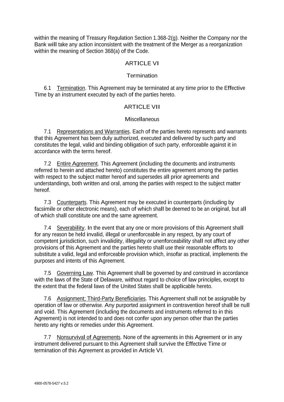 4900-0578-5427 v.5.2 within the meaning of Treasury Regulation Section 1.368-2(g). Neither the Company nor the Bank will take any action inconsistent with the treatment of the Merger as a reorganization within the meaning of Section 368(a) of the Code. ARTICLE VI Termination 6.1 Termination. This Agreement may be terminated at any time prior to the Effective Time by an instrument executed by each of the parties hereto. ARTICLE VII Miscellaneous 7.1 Representations and Warranties. Each of the parties hereto represents and warrants that this Agreement has been duly authorized, executed and delivered by such party and constitutes the legal, valid and binding obligation of such party, enforceable against it in accordance with the terms hereof. 7.2 Entire Agreement. This Agreement (including the documents and instruments referred to herein and attached hereto) constitutes the entire agreement among the parties with respect to the subject matter hereof and supersedes all prior agreements and understandings, both written and oral, among the parties with respect to the subject matter hereof. 7.3 Counterparts. This Agreement may be executed in counterparts (including by facsimile or other electronic means), each of which shall be deemed to be an original, but all of which shall constitute one and the same agreement. 7.4 Severability. In the event that any one or more provisions of this Agreement shall for any reason be held invalid, illegal or unenforceable in any respect, by any court of competent jurisdiction, such invalidity, illegality or unenforceability shall not affect any other provisions of this Agreement and the parties hereto shall use their reasonable efforts to substitute a valid, legal and enforceable provision which, insofar as practical, implements the purposes and intents of this Agreement. 7.5 Governing Law. This Agreement shall be governed by and construed in accordance with the laws of the State of Delaware, without regard to choice of law principles, except to the extent that the federal laws of the United States shall be applicable hereto. 7.6 Assignment; Third-Party Beneficiaries. This Agreement shall not be assignable by operation of law or otherwise. Any purported assignment in contravention hereof shall be null and void. This Agreement (including the documents and instruments referred to in this Agreement) is not intended to and does not confer upon any person other than the parties hereto any rights or remedies under this Agreement. 7.7 Nonsurvival of Agreements. None of the agreements in this Agreement or in any instrument delivered pursuant to this Agreement shall survive the Effective Time or termination of this Agreement as provided in Article VI.