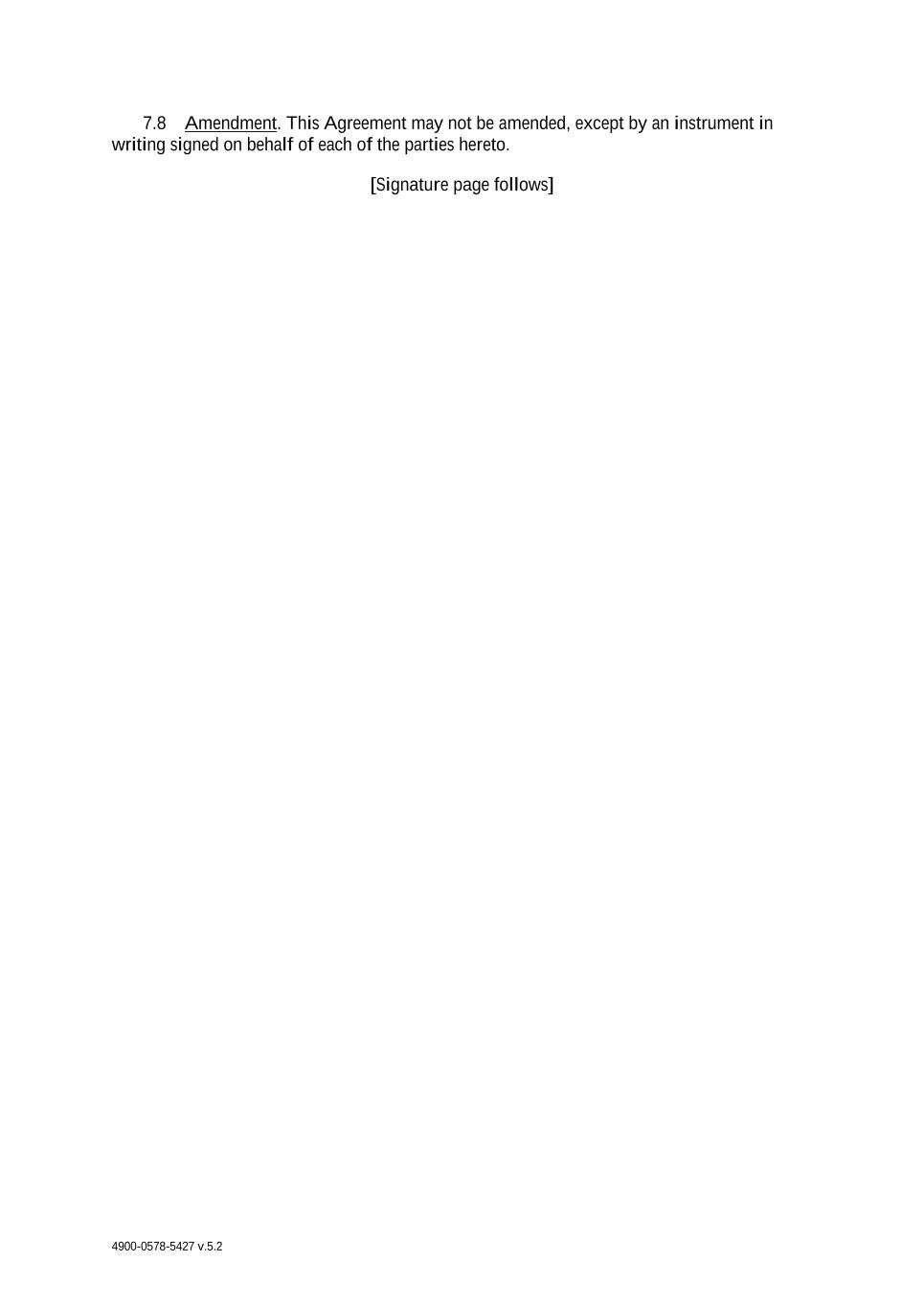 4900-0578-5427 v.5.2 7.8 Amendment. This Agreement may not be amended, except by an instrument in writing signed on behalf of each of the parties hereto. [Signature page follows]