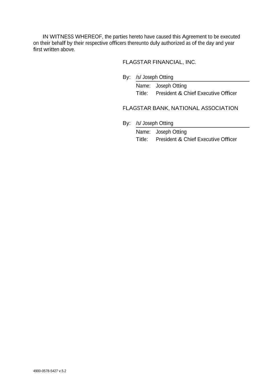 4900-0578-5427 v.5.2 IN WITNESS WHEREOF, the parties hereto have caused this Agreement to be executed on their behalf by their respective officers thereunto duly authorized as of the day and year first written above. FLAGSTAR FINANCIAL, INC. By: /s/ Joseph Otting Name: Joseph Otting Title: President & Chief Executive Officer FLAGSTAR BANK, NATIONAL ASSOCIATION By: /s/ Joseph Otting Name: Joseph Otting Title: President & Chief Executive Officer