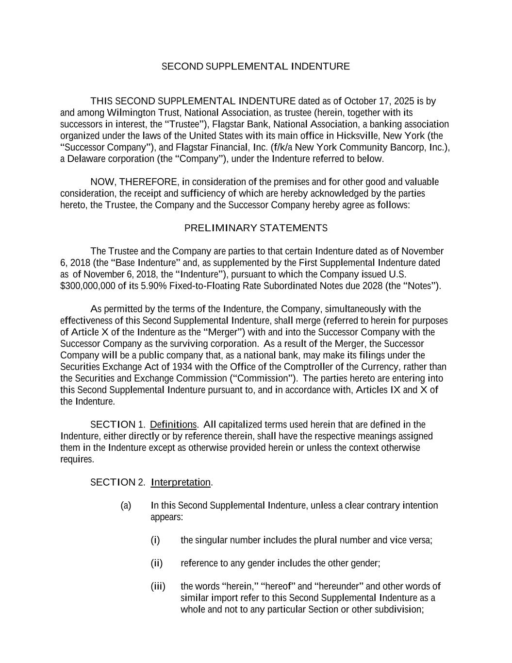 SECOND SUPPLEMENTAL INDENTURE THIS SECOND SUPPLEMENTAL INDENTURE dated as of October 17, 2025 is by and among Wilmington Trust, National Association, as trustee (herein, together with its successors in interest, the “Trustee”), Flagstar Bank, National Association, a banking association organized under the laws of the United States with its main office in Hicksville, New York (the “Successor Company”), and Flagstar Financial, Inc. (f/k/a New York Community Bancorp, Inc.), a Delaware corporation (the “Company”), under the Indenture referred to below. NOW, THEREFORE, in consideration of the premises and for other good and valuable consideration, the receipt and sufficiency of which are hereby acknowledged by the parties hereto, the Trustee, the Company and the Successor Company hereby agree as follows: PRELIMINARY STATEMENTS The Trustee and the Company are parties to that certain Indenture dated as of November 6, 2018 (the “Base Indenture” and, as supplemented by the First Supplemental Indenture dated as of November 6, 2018, the “Indenture”), pursuant to which the Company issued U.S. $300,000,000 of its 5.90% Fixed-to-Floating Rate Subordinated Notes due 2028 (the “Notes”). As permitted by the terms of the Indenture, the Company, simultaneously with the effectiveness of this Second Supplemental Indenture, shall merge (referred to herein for purposes of Article X of the Indenture as the “Merger”) with and into the Successor Company with the Successor Company as the surviving corporation. As a result of the Merger, the Successor Company will be a public company that, as a national bank, may make its filings under the Securities Exchange Act of 1934 with the Office of the Comptroller of the Currency, rather than the Securities and Exchange Commission (“Commission”). The parties hereto are entering into this Second Supplemental Indenture pursuant to, and in accordance with, Articles IX and X of the Indenture. SECTION 1. Definitions. All capitalized terms used herein that are defined in the Indenture, either directly or by reference therein, shall have the respective meanings assigned them in the Indenture except as otherwise provided herein or unless the context otherwise requires. SECTION 2. Interpretation. (a) In this Second Supplemental Indenture, unless a clear contrary intention appears: (i) the singular number includes the plural number and vice versa; (ii) reference to any gender includes the other gender; (iii) the words “herein,” “hereof” and “hereunder” and other words of similar import refer to this Second Supplemental Indenture as a whole and not to any particular Section or other subdivision;