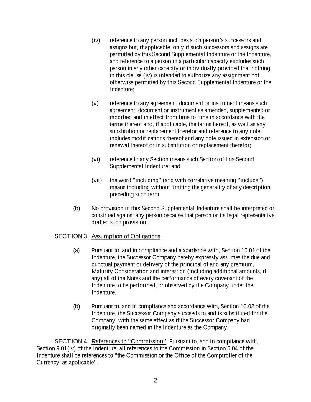 2 (iv) reference to any person includes such person’s successors and assigns but, if applicable, only if such successors and assigns are permitted by this Second Supplemental Indenture or the Indenture, and reference to a person in a particular capacity excludes such person in any other capacity or individually provided that nothing in this clause (iv) is intended to authorize any assignment not otherwise permitted by this Second Supplemental Indenture or the Indenture; (v) reference to any agreement, document or instrument means such agreement, document or instrument as amended, supplemented or modified and in effect from time to time in accordance with the terms thereof and, if applicable, the terms hereof, as well as any substitution or replacement therefor and reference to any note includes modifications thereof and any note issued in extension or renewal thereof or in substitution or replacement therefor; (vi) reference to any Section means such Section of this Second Supplemental Indenture; and (vii) the word “including” (and with correlative meaning “include”) means including without limiting the generality of any description preceding such term. (b) No provision in this Second Supplemental Indenture shall be interpreted or construed against any person because that person or its legal representative drafted such provision. SECTION 3. Assumption of Obligations. (a) Pursuant to, and in compliance and accordance with, Section 10.01 of the Indenture, the Successor Company hereby expressly assumes the due and punctual payment or delivery of the principal of and any premium, Maturity Consideration and interest on (including additional amounts, if any) all of the Notes and the performance of every covenant of the Indenture to be performed, or observed by the Company under the Indenture. (b) Pursuant to, and in compliance and accordance with, Section 10.02 of the Indenture, the Successor Company succeeds to and is substituted for the Company, with the same effect as if the Successor Company had originally been named in the Indenture as the Company. SECTION 4. References to “Commission”. Pursuant to, and in compliance with, Section 9.01(iv) of the Indenture, all references to the Commission in Section 6.04 of the Indenture shall be references to “the Commission or the Office of the Comptroller of the Currency, as applicable”.