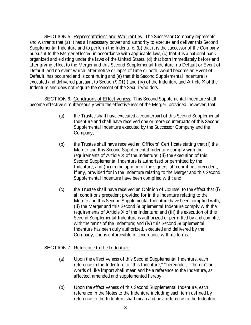 3 SECTION 5. Representations and Warranties. The Successor Company represents and warrants that (a) it has all necessary power and authority to execute and deliver this Second Supplemental Indenture and to perform the Indenture, (b) that it is the successor of the Company pursuant to the Merger effected in accordance with applicable law, (c) that it is a national bank organized and existing under the laws of the United States, (d) that both immediately before and after giving effect to the Merger and this Second Supplemental Indenture, no Default or Event of Default, and no event which, after notice or lapse of time or both, would become an Event of Default, has occurred and is continuing and (e) that this Second Supplemental Indenture is executed and delivered pursuant to Section 9.01(i) and (iv) of the Indenture and Article X of the Indenture and does not require the consent of the Securityholders. SECTION 6. Conditions of Effectiveness. This Second Supplemental Indenture shall become effective simultaneously with the effectiveness of the Merger, provided, however, that: (a) the Trustee shall have executed a counterpart of this Second Supplemental Indenture and shall have received one or more counterparts of this Second Supplemental Indenture executed by the Successor Company and the Company; (b) the Trustee shall have received an Officers’ Certificate stating that (i) the Merger and this Second Supplemental Indenture comply with the requirements of Article X of the Indenture; (ii) the execution of this Second Supplemental Indenture is authorized or permitted by the Indenture; and (iii) in the opinion of the signers, all conditions precedent, if any, provided for in the Indenture relating to the Merger and this Second Supplemental Indenture have been complied with; and (c) the Trustee shall have received an Opinion of Counsel to the effect that (i) all conditions precedent provided for in the Indenture relating to the Merger and this Second Supplemental Indenture have been complied with; (ii) the Merger and this Second Supplemental Indenture comply with the requirements of Article X of the Indenture; and (iii) the execution of this Second Supplemental Indenture is authorized or permitted by and complies with the terms of the Indenture; and (iv) this Second Supplemental Indenture has been duly authorized, executed and delivered by the Company, and is enforceable in accordance with its terms. SECTION 7. Reference to the Indenture. (a) Upon the effectiveness of this Second Supplemental Indenture, each reference in the Indenture to “this Indenture,” “hereunder,” “herein” or words of like import shall mean and be a reference to the Indenture, as affected, amended and supplemented hereby. (b) Upon the effectiveness of this Second Supplemental Indenture, each reference in the Notes to the Indenture including each term defined by reference to the Indenture shall mean and be a reference to the Indenture