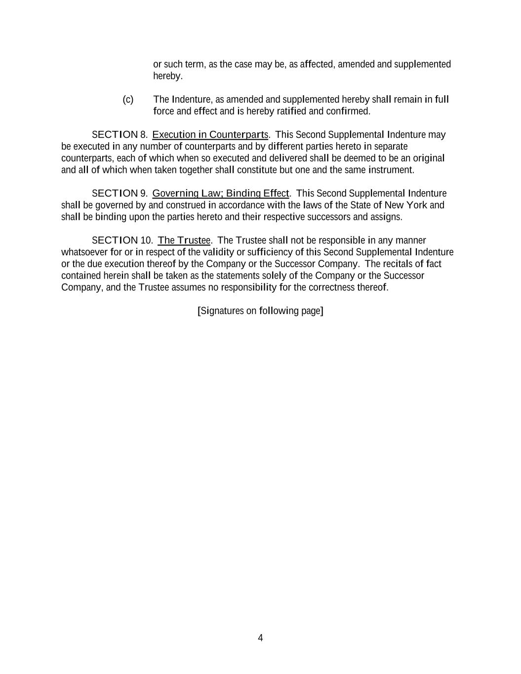 4 or such term, as the case may be, as affected, amended and supplemented hereby. (c) The Indenture, as amended and supplemented hereby shall remain in full force and effect and is hereby ratified and confirmed. SECTION 8. Execution in Counterparts. This Second Supplemental Indenture may be executed in any number of counterparts and by different parties hereto in separate counterparts, each of which when so executed and delivered shall be deemed to be an original and all of which when taken together shall constitute but one and the same instrument. SECTION 9. Governing Law; Binding Effect. This Second Supplemental Indenture shall be governed by and construed in accordance with the laws of the State of New York and shall be binding upon the parties hereto and their respective successors and assigns. SECTION 10. The Trustee. The Trustee shall not be responsible in any manner whatsoever for or in respect of the validity or sufficiency of this Second Supplemental Indenture or the due execution thereof by the Company or the Successor Company. The recitals of fact contained herein shall be taken as the statements solely of the Company or the Successor Company, and the Trustee assumes no responsibility for the correctness thereof. [Signatures on following page]