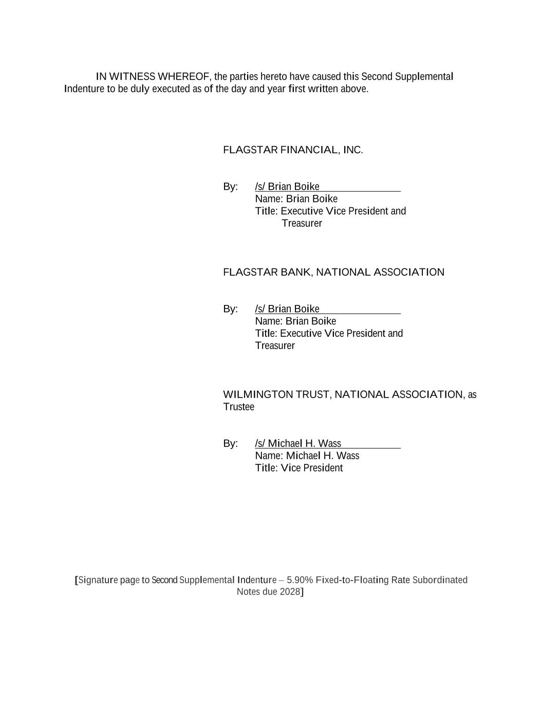 [Signature page to Second Supplemental Indenture – 5.90% Fixed-to-Floating Rate Subordinated Notes due 2028] IN WITNESS WHEREOF, the parties hereto have caused this Second Supplemental Indenture to be duly executed as of the day and year first written above. FLAGSTAR FINANCIAL, INC. By: /s/ Brian Boike Name: Brian Boike Title: Executive Vice President and Treasurer FLAGSTAR BANK, NATIONAL ASSOCIATION By: /s/ Brian Boike Name: Brian Boike Title: Executive Vice President and Treasurer WILMINGTON TRUST, NATIONAL ASSOCIATION, as Trustee By: /s/ Michael H. Wass Name: Michael H. Wass Title: Vice President