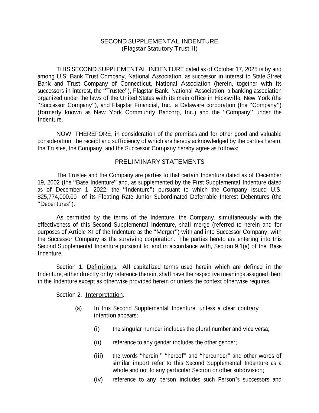 SECOND SUPPLEMENTAL INDENTURE (Flagstar Statutory Trust II) THIS SECOND SUPPLEMENTAL INDENTURE dated as of October 17, 2025 is by and among U.S. Bank Trust Company, National Association, as successor in interest to State Street Bank and Trust Company of Connecticut, National Association (herein, together with its successors in interest, the “Trustee”), Flagstar Bank, National Association, a banking association organized under the laws of the United States with its main office in Hicksville, New York (the “Successor Company”), and Flagstar Financial, Inc., a Delaware corporation (the “Company”) (formerly known as New York Community Bancorp, Inc.) and the “Company” under the Indenture. NOW, THEREFORE, in consideration of the premises and for other good and valuable consideration, the receipt and sufficiency of which are hereby acknowledged by the parties hereto, the Trustee, the Company, and the Successor Company hereby agree as follows: PRELIMINARY STATEMENTS The Trustee and the Company are parties to that certain Indenture dated as of December 19, 2002 (the “Base Indenture” and, as supplemented by the First Supplemental Indenture dated as of December 1, 2022, the “Indenture”) pursuant to which the Company issued U.S. $25,774,000.00 of its Floating Rate Junior Subordinated Deferrable Interest Debentures (the “Debentures”). As permitted by the terms of the Indenture, the Company, simultaneously with the effectiveness of this Second Supplemental Indenture, shall merge (referred to herein and for purposes of Article XI of the Indenture as the “Merger”) with and into Successor Company, with the Successor Company as the surviving corporation. The parties hereto are entering into this Second Supplemental Indenture pursuant to, and in accordance with, Section 9.1(a) of the Base Indenture. Section 1. Definitions. All capitalized terms used herein which are defined in the Indenture, either directly or by reference therein, shall have the respective meanings assigned them in the Indenture except as otherwise provided herein or unless the context otherwise requires. Section 2. Interpretation. (a) In this Second Supplemental Indenture, unless a clear contrary intention appears: (i) the singular number includes the plural number and vice versa; (ii) reference to any gender includes the other gender; (iii) the words “herein,” “hereof” and “hereunder” and other words of similar import refer to this Second Supplemental Indenture as a whole and not to any particular Section or other subdivision; (iv) reference to any person includes such Person’s successors and