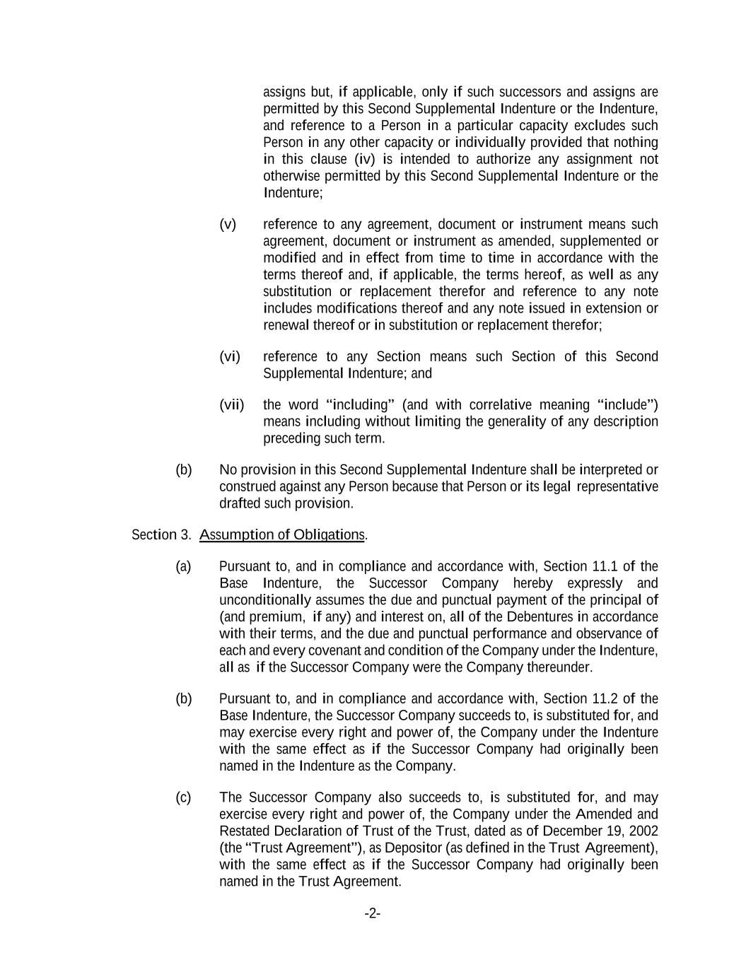 -2- assigns but, if applicable, only if such successors and assigns are permitted by this Second Supplemental Indenture or the Indenture, and reference to a Person in a particular capacity excludes such Person in any other capacity or individually provided that nothing in this clause (iv) is intended to authorize any assignment not otherwise permitted by this Second Supplemental Indenture or the Indenture; (v) reference to any agreement, document or instrument means such agreement, document or instrument as amended, supplemented or modified and in effect from time to time in accordance with the terms thereof and, if applicable, the terms hereof, as well as any substitution or replacement therefor and reference to any note includes modifications thereof and any note issued in extension or renewal thereof or in substitution or replacement therefor; (vi) reference to any Section means such Section of this Second Supplemental Indenture; and (vii) the word “including” (and with correlative meaning “include”) means including without limiting the generality of any description preceding such term. (b) No provision in this Second Supplemental Indenture shall be interpreted or construed against any Person because that Person or its legal representative drafted such provision. Section 3. Assumption of Obligations. (a) Pursuant to, and in compliance and accordance with, Section 11.1 of the Base Indenture, the Successor Company hereby expressly and unconditionally assumes the due and punctual payment of the principal of (and premium, if any) and interest on, all of the Debentures in accordance with their terms, and the due and punctual performance and observance of each and every covenant and condition of the Company under the Indenture, all as if the Successor Company were the Company thereunder. (b) Pursuant to, and in compliance and accordance with, Section 11.2 of the Base Indenture, the Successor Company succeeds to, is substituted for, and may exercise every right and power of, the Company under the Indenture with the same effect as if the Successor Company had originally been named in the Indenture as the Company. (c) The Successor Company also succeeds to, is substituted for, and may exercise every right and power of, the Company under the Amended and Restated Declaration of Trust of the Trust, dated as of December 19, 2002 (the “Trust Agreement”), as Depositor (as defined in the Trust Agreement), with the same effect as if the Successor Company had originally been named in the Trust Agreement.