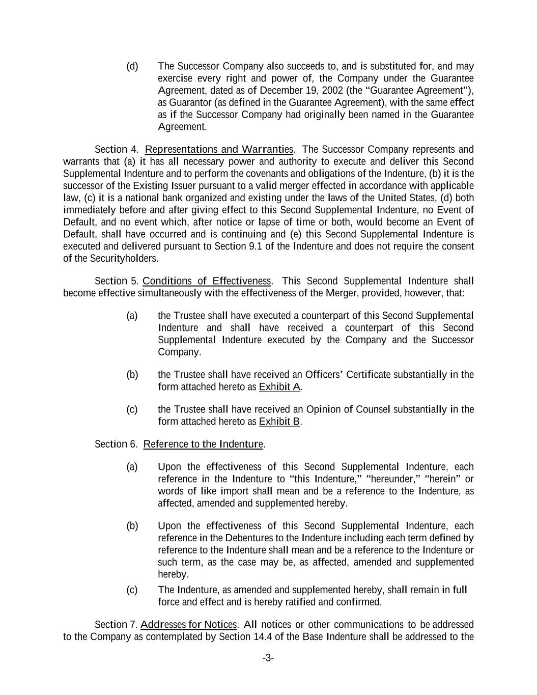 -3- (d) The Successor Company also succeeds to, and is substituted for, and may exercise every right and power of, the Company under the Guarantee Agreement, dated as of December 19, 2002 (the “Guarantee Agreement”), as Guarantor (as defined in the Guarantee Agreement), with the same effect as if the Successor Company had originally been named in the Guarantee Agreement. Section 4. Representations and Warranties. The Successor Company represents and warrants that (a) it has all necessary power and authority to execute and deliver this Second Supplemental Indenture and to perform the covenants and obligations of the Indenture, (b) it is the successor of the Existing Issuer pursuant to a valid merger effected in accordance with applicable law, (c) it is a national bank organized and existing under the laws of the United States, (d) both immediately before and after giving effect to this Second Supplemental Indenture, no Event of Default, and no event which, after notice or lapse of time or both, would become an Event of Default, shall have occurred and is continuing and (e) this Second Supplemental Indenture is executed and delivered pursuant to Section 9.1 of the Indenture and does not require the consent of the Securityholders. Section 5. Conditions of Effectiveness. This Second Supplemental Indenture shall become effective simultaneously with the effectiveness of the Merger, provided, however, that: (a) the Trustee shall have executed a counterpart of this Second Supplemental Indenture and shall have received a counterpart of this Second Supplemental Indenture executed by the Company and the Successor Company. (b) the Trustee shall have received an Officers’ Certificate substantially in the form attached hereto as Exhibit A. (c) the Trustee shall have received an Opinion of Counsel substantially in the form attached hereto as Exhibit B. Section 6. Reference to the Indenture. (a) Upon the effectiveness of this Second Supplemental Indenture, each reference in the Indenture to “this Indenture,” “hereunder,” “herein” or words of like import shall mean and be a reference to the Indenture, as affected, amended and supplemented hereby. (b) Upon the effectiveness of this Second Supplemental Indenture, each reference in the Debentures to the Indenture including each term defined by reference to the Indenture shall mean and be a reference to the Indenture or such term, as the case may be, as affected, amended and supplemented hereby. (c) The Indenture, as amended and supplemented hereby, shall remain in full force and effect and is hereby ratified and confirmed. Section 7. Addresses for Notices. All notices or other communications to be addressed to the Company as contemplated by Section 14.4 of the Base Indenture shall be addressed to the