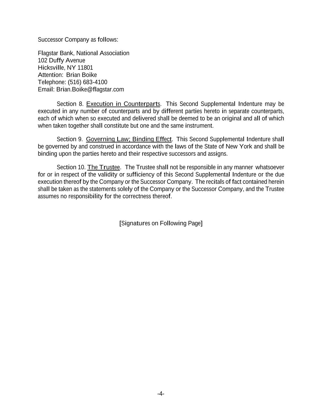 -4- Successor Company as follows: Flagstar Bank, National Association 102 Duffy Avenue Hicksville, NY 11801 Attention: Brian Boike Telephone: (516) 683-4100 Email: Brian.Boike@flagstar.com Section 8. Execution in Counterparts. This Second Supplemental Indenture may be executed in any number of counterparts and by different parties hereto in separate counterparts, each of which when so executed and delivered shall be deemed to be an original and all of which when taken together shall constitute but one and the same instrument. Section 9. Governing Law; Binding Effect. This Second Supplemental Indenture shall be governed by and construed in accordance with the laws of the State of New York and shall be binding upon the parties hereto and their respective successors and assigns. Section 10. The Trustee. The Trustee shall not be responsible in any manner whatsoever for or in respect of the validity or sufficiency of this Second Supplemental Indenture or the due execution thereof by the Company or the Successor Company. The recitals of fact contained herein shall be taken as the statements solely of the Company or the Successor Company, and the Trustee assumes no responsibility for the correctness thereof. [Signatures on Following Page]