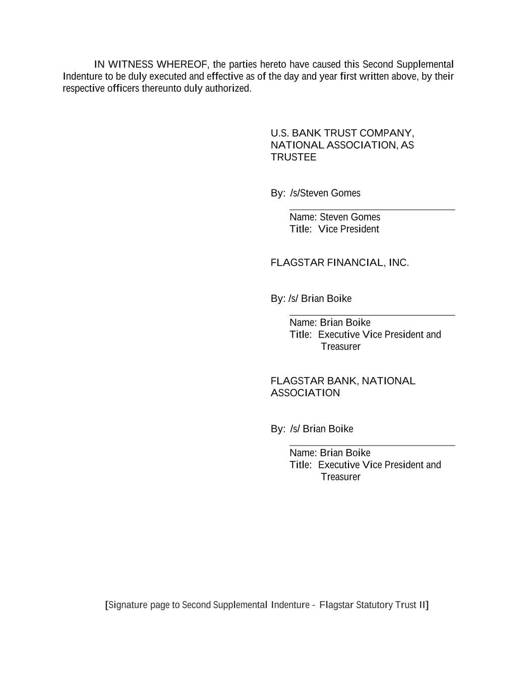 [Signature page to Second Supplemental Indenture - Flagstar Statutory Trust II] IN WITNESS WHEREOF, the parties hereto have caused this Second Supplemental Indenture to be duly executed and effective as of the day and year first written above, by their respective officers thereunto duly authorized. U.S. BANK TRUST COMPANY, NATIONAL ASSOCIATION, AS TRUSTEE By: /s/Steven Gomes Name: Steven Gomes Title: Vice President FLAGSTAR FINANCIAL, INC. By: /s/ Brian Boike Name: Brian Boike Title: Executive Vice President and Treasurer FLAGSTAR BANK, NATIONAL ASSOCIATION By: /s/ Brian Boike Name: Brian Boike Title: Executive Vice President and Treasurer