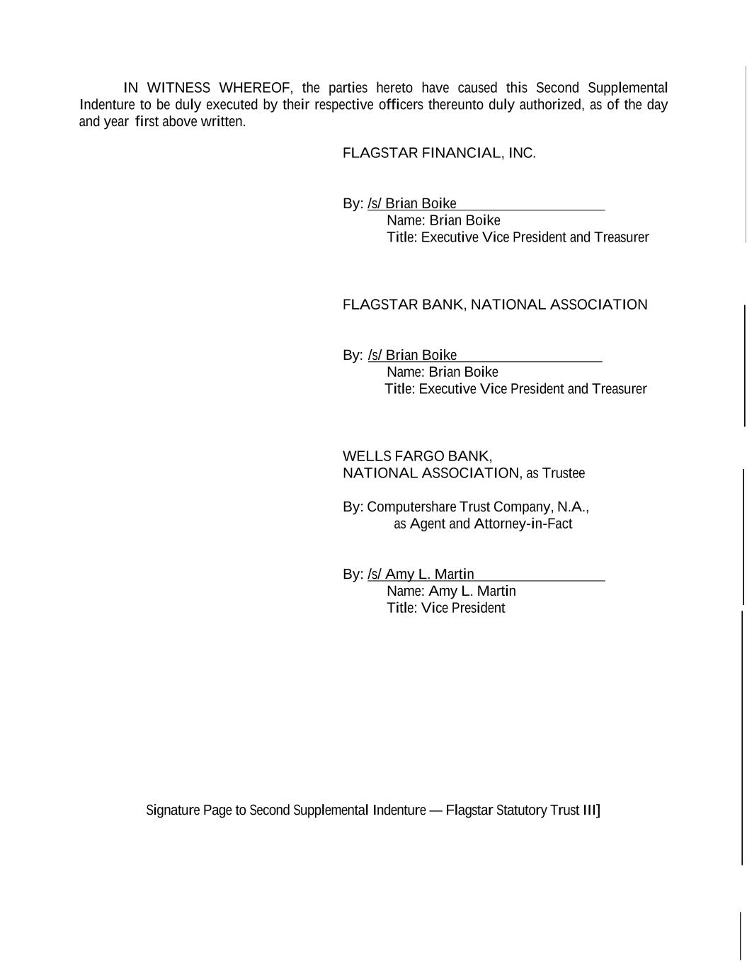 IN WITNESS WHEREOF, the parties hereto have caused this Second Supplemental Indenture to be duly executed by their respective officers thereunto duly authorized, as of the day and year first above written. FLAGSTAR FINANCIAL, INC. By: /s/ Brian Boike Name: Brian Boike Title: Executive Vice President and Treasurer FLAGSTAR BANK, NATIONAL ASSOCIATION By: /s/ Brian Boike Name: Brian Boike Title: Executive Vice President and Treasurer WELLS FARGO BANK, NATIONAL ASSOCIATION, as Trustee By: Computershare Trust Company, N.A., as Agent and Attorney-in-Fact By: /s/ Amy L. Martin Name: Amy L. Martin Title: Vice President Signature Page to Second Supplemental Indenture — Flagstar Statutory Trust III]