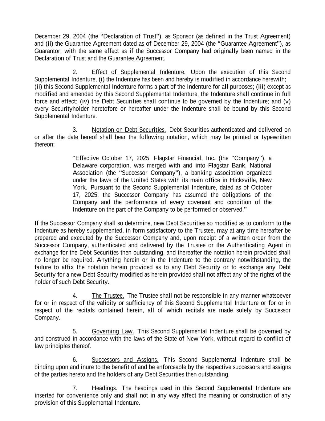 December 29, 2004 (the “Declaration of Trust”), as Sponsor (as defined in the Trust Agreement) and (ii) the Guarantee Agreement dated as of December 29, 2004 (the “Guarantee Agreement”), as Guarantor, with the same effect as if the Successor Company had originally been named in the Declaration of Trust and the Guarantee Agreement. 2. Effect of Supplemental Indenture. Upon the execution of this Second Supplemental Indenture, (i) the Indenture has been and hereby is modified in accordance herewith; (ii) this Second Supplemental Indenture forms a part of the Indenture for all purposes; (iii) except as modified and amended by this Second Supplemental Indenture, the Indenture shall continue in full force and effect; (iv) the Debt Securities shall continue to be governed by the Indenture; and (v) every Securityholder heretofore or hereafter under the Indenture shall be bound by this Second Supplemental Indenture. 3. Notation on Debt Securities. Debt Securities authenticated and delivered on or after the date hereof shall bear the following notation, which may be printed or typewritten thereon: “Effective October 17, 2025, Flagstar Financial, Inc. (the “Company”), a Delaware corporation, was merged with and into Flagstar Bank, National Association (the “Successor Company”), a banking association organized under the laws of the United States with its main office in Hicksville, New York. Pursuant to the Second Supplemental Indenture, dated as of October 17, 2025, the Successor Company has assumed the obligations of the Company and the performance of every covenant and condition of the Indenture on the part of the Company to be performed or observed.” If the Successor Company shall so determine, new Debt Securities so modified as to conform to the Indenture as hereby supplemented, in form satisfactory to the Trustee, may at any time hereafter be prepared and executed by the Successor Company and, upon receipt of a written order from the Successor Company, authenticated and delivered by the Trustee or the Authenticating Agent in exchange for the Debt Securities then outstanding, and thereafter the notation herein provided shall no longer be required. Anything herein or in the Indenture to the contrary notwithstanding, the failure to affix the notation herein provided as to any Debt Security or to exchange any Debt Security for a new Debt Security modified as herein provided shall not affect any of the rights of the holder of such Debt Security. 4. The Trustee. The Trustee shall not be responsible in any manner whatsoever for or in respect of the validity or sufficiency of this Second Supplemental Indenture or for or in respect of the recitals contained herein, all of which recitals are made solely by Successor Company. 5. Governing Law. This Second Supplemental Indenture shall be governed by and construed in accordance with the laws of the State of New York, without regard to conflict of law principles thereof. 6. Successors and Assigns. This Second Supplemental Indenture shall be binding upon and inure to the benefit of and be enforceable by the respective successors and assigns of the parties hereto and the holders of any Debt Securities then outstanding. 7. Headings. The headings used in this Second Supplemental Indenture are inserted for convenience only and shall not in any way affect the meaning or construction of any provision of this Supplemental Indenture.