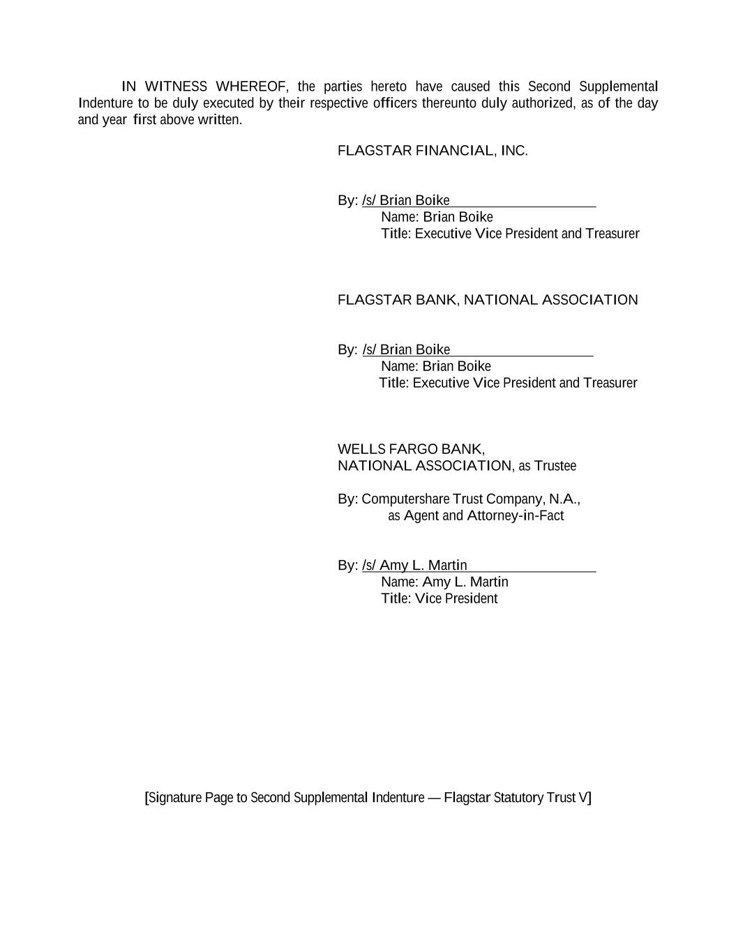 IN WITNESS WHEREOF, the parties hereto have caused this Second Supplemental Indenture to be duly executed by their respective officers thereunto duly authorized, as of the day and year first above written. FLAGSTAR FINANCIAL, INC. By: /s/ Brian Boike Name: Brian Boike Title: Executive Vice President and Treasurer FLAGSTAR BANK, NATIONAL ASSOCIATION By: /s/ Brian Boike Name: Brian Boike Title: Executive Vice President and Treasurer WELLS FARGO BANK, NATIONAL ASSOCIATION, as Trustee By: Computershare Trust Company, N.A., as Agent and Attorney-in-Fact By: /s/ Amy L. Martin Name: Amy L. Martin Title: Vice President [Signature Page to Second Supplemental Indenture — Flagstar Statutory Trust V]