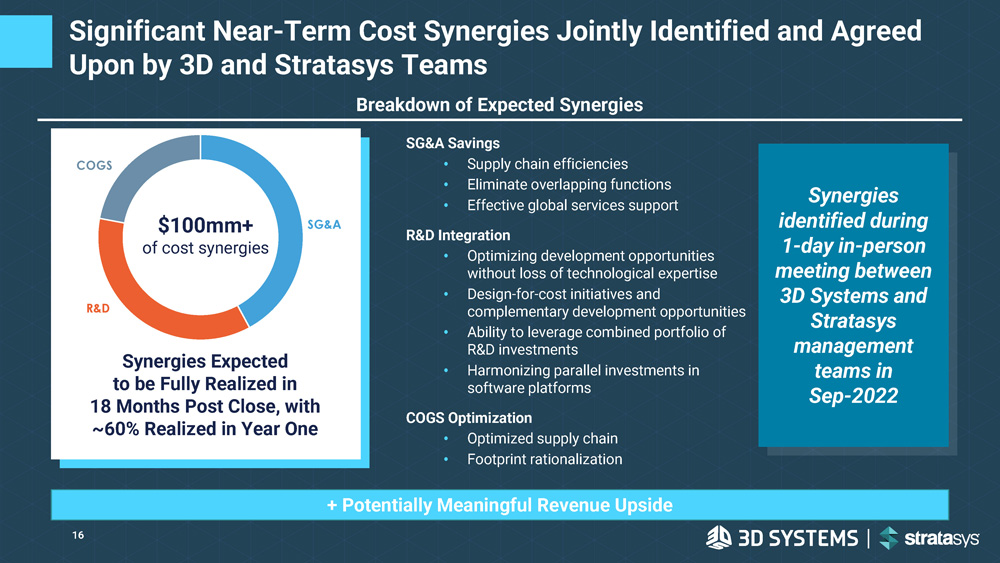 Significant Near - Term Cost Synergies Jointly Identified and Agreed Upon by 3D and Stratasys Teams SG&A Savings • Supply chain efficiencies • Eliminate overlapping functions • Effective global services support R&D Integration • Optimizing development opportunities without loss of technological expertise • Design - for - cost initiatives and complementary development opportunities • Ability to leverage combined portfolio of R&D investments • Harmonizing parallel investments in software platforms COGS Optimization • Optimized supply chain • Footprint rationalization SG&A R&D COGS $100mm+ of cost synergies Synergies Expected to be Fully Realized in 18 Months Post Close, with ~60% Realized in Year One 16 + Potentially Meaningful Revenue Upside Breakdown of Expected Synergies Synergies identified during 1 - day in - person meeting between 3D Systems and Stratasys management teams in Sep - 2022