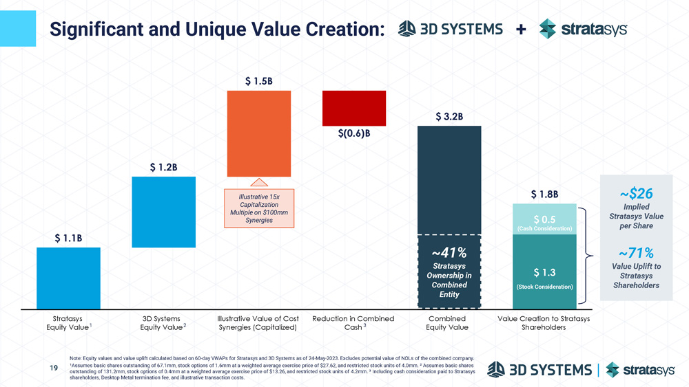 Best - in - Class Combined Financial Profile Sources: Company Filings. Note: 1 Assumes approximately $240mm of cash and cash equivalents on Stratasys’s balance sheet and approximately $530mm of cash and cash equivalents on 3D Systems’ balance sheet. 2 Based on midpoint of CY2023E guidance. 3 Based on CY2023E EBITDA guidance and $100mm run - rate cost synergies. 4 Based on CY2023E EBITDA guidance and $50mm of run - rate cost synergies as stated in investor presentation published 20 - Jun - 2023. 17 ~$1.2bn Combined 2023E Revenue 2 (More than $1bn in Revenue TODAY , NOT by 2026 ) ~$145mm Combined 2023E EBITDA 3 Assuming run rate cost synergies ~12% Combined 2023E EBITDA Margin 3 Assuming run rate cost synergies ~$885mm Combined 2023E Revenue 2 ~$55mm Combined 2023E EBITDA 4 Assuming run rate cost synergies ~6% Combined 2023E EBITDA Margin 4 Assuming run rate cost synergies ~$150mm Pro Forma Cash on Balance Sheet 1 (No debt or equity financing contemplated, ~2x net leverage at close)
