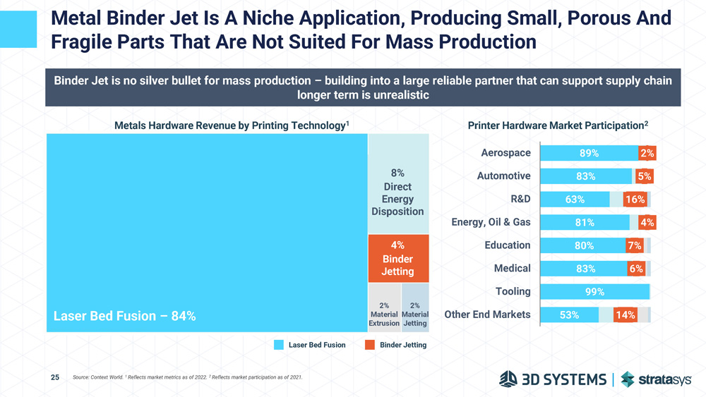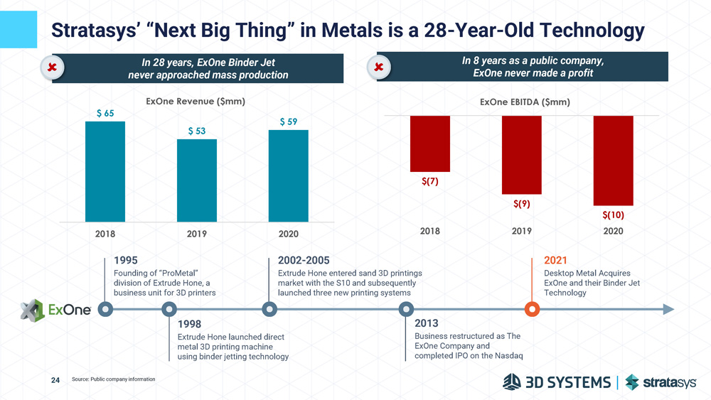 1998 Extrude Hone launched direct metal 3D printing machine using binder jetting technology Stratasys’ “Next Big Thing” in Metals is a 28 - Year - Old Technology 2021 Desktop Metal Acquires ExOne and their Binder Jet Technology 2002 - 2005 Extrude Hone entered sand 3D printings market with the S10 and subsequently launched three new printing systems 2013 Business restructured as The ExOne Company and completed IPO on the Nasdaq Source: Public company information In 8 years as a public company, ExOne never made a profit $ 65 $ 53 $ 59 2018 2019 1995 Founding of “ProMetal” division of Extrude Hone, a business unit for 3D printers 2020 ExOne Revenue ($mm) $(7) $(9) 2018 2019 $(10) 2020 ExOne EBITDA ($mm) In 28 years, ExOne Binder Jet never approached mass production   24
