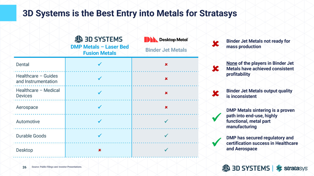 3D Systems is the Best Entry into Metals for Stratasys Binder Jet Metals DMP Metals – Laser Bed Fusion Metals  x Dental  x Healthcare – Guides and Instrumentation  x Healthcare – Medical Devices  x Aerospace x x Automotive x x Durable Goods x  Desktop Binder Jet Metals not ready for mass production None of the players in Binder Jet Metals have achieved consistent profitability Binder Jet Metals output quality is inconsistent    Source: Public Filings and Investor Presentations. 26 DMP Metals sintering is a proven path into end - use, highly functional, metal part manufacturing DMP has secured regulatory and certification success in Healthcare and Aerospace x x