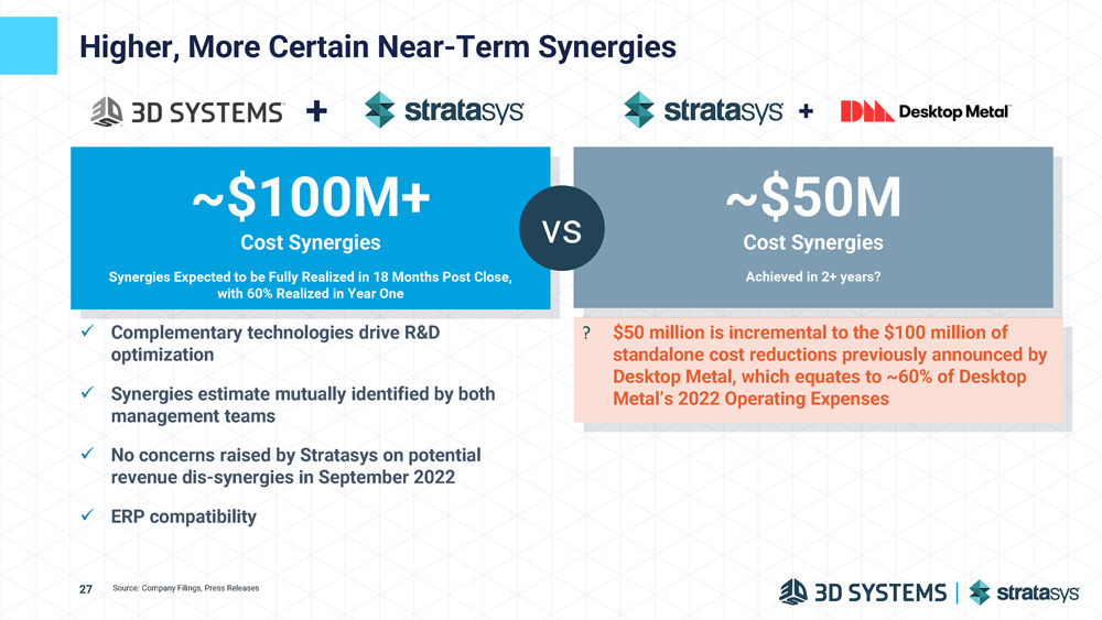 Higher, More Certain Near - Term Synergies + ~$50M Cost Synergies Achieved in 2+ years? ~$100M+ ? $50 million is incremental to the $100 million of standalone cost reductions previously announced by Desktop Metal, which equates to ~60% of Desktop Metal’s 2022 Operating Expenses Cost Synergies Synergies Expected to be Fully Realized in 18 Months Post Close, with 60% Realized in Year One x Complementary technologies drive R&D optimization x Synergies estimate mutually identified by both management teams x No concerns raised by Stratasys on potential revenue dis - synergies in September 2022 x ERP compatibility vs Source: Company Filings, Press Releases 27
