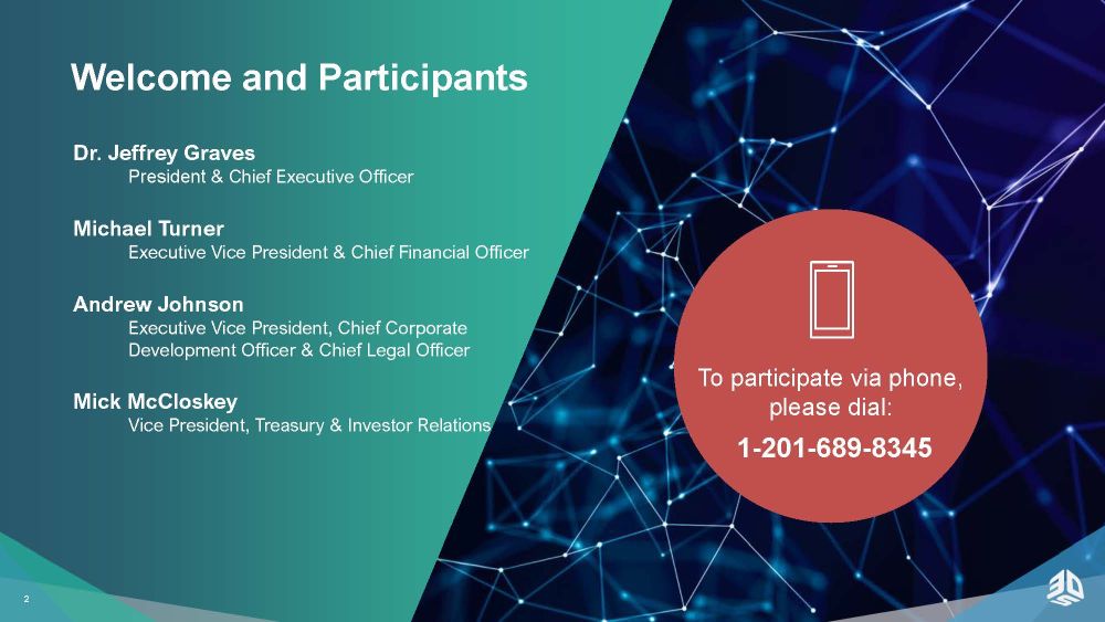 2 Welcome and Participants Dr. Jeffrey Graves President & Chief Executive Officer Michael Turner Executive Vice President & Chief Financial Officer Andrew Johnson Executive Vice President, Chief Corporate Development Officer & Chief Legal Officer Mick McCloskey Vice President, Treasury & Investor Relations To participate via phone, please dial: 1 - 201 - 689 - 8345