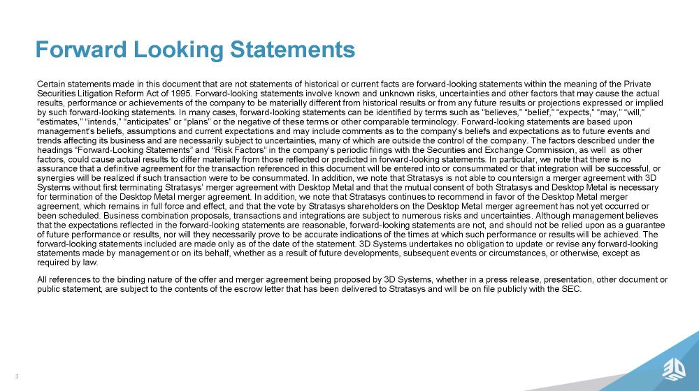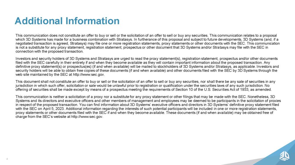 Certain statements made in this document that are not statements of historical or current facts are forward - looking statements w ithin the meaning of the Private Securities Litigation Reform Act of 1995. Forward - looking statements involve known and unknown risks, uncertainties and other fa ctors that may cause the actual results, performance or achievements of the company to be materially different from historical results or from any future res ult s or projections expressed or implied by such forward - looking statements. In many cases, forward - looking statements can be identified by terms such as “believes,” “be lief,” “expects,” “may,” “will,” “estimates,” “intends,” “anticipates” or “plans” or the negative of these terms or other comparable terminology. Forward - looking statements are based upon management’s beliefs, assumptions and current expectations and may include comments as to the company’s beliefs and expectati ons as to future events and trends affecting its business and are necessarily subject to uncertainties, many of which are outside the control of the comp any . The factors described under the headings “Forward - Looking Statements” and “Risk Factors” in the company’s periodic filings with the Securities and Exchange Comm ission, as well as other factors, could cause actual results to differ materially from those reflected or predicted in forward - looking statements. In par ticular, we note that there is no assurance that a definitive agreement for the transaction referenced in this document will be entered into or consummated or tha t integration will be successful, or synergies will be realized if such transaction were to be consummated. In addition, we note that Stratasys is not able to cou nte rsign a merger agreement with 3D Systems without first terminating Stratasys’ merger agreement with Desktop Metal and that the mutual consent of both Stratasy s a nd Desktop Metal is necessary for termination of the Desktop Metal merger agreement. In addition, we note that Stratasys continues to recommend in favor of th e Desktop Metal merger agreement, which remains in full force and effect, and that the vote by Stratasys shareholders on the Desktop Metal merger ag ree ment has not yet occurred or been scheduled. Business combination proposals, transactions and integrations are subject to numerous risks and uncertainties . A lthough management believes that the expectations reflected in the forward - looking statements are reasonable, forward - looking statements are not, and should not be relied upon as a guarantee of future performance or results, nor will they necessarily prove to be accurate indications of the times at which such perfo rma nce or results will be achieved. The forward - looking statements included are made only as of the date of the statement. 3D Systems undertakes no obligation to update or revise any forward - looking statements made by management or on its behalf, whether as a result of future developments, subsequent events or circumstance s, or otherwise, except as required by law. All references to the binding nature of the offer and merger agreement being proposed by 3D Systems, whether in a press relea se, presentation, other document or public statement, are subject to the contents of the escrow letter that has been delivered to Stratasys and will be on file p ubl icly with the SEC. 3 Forward Looking Statements