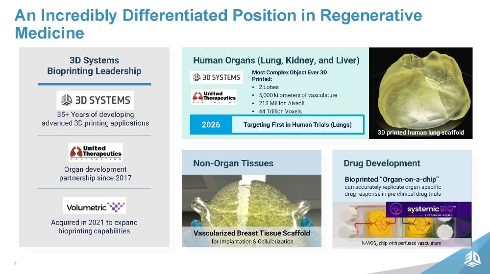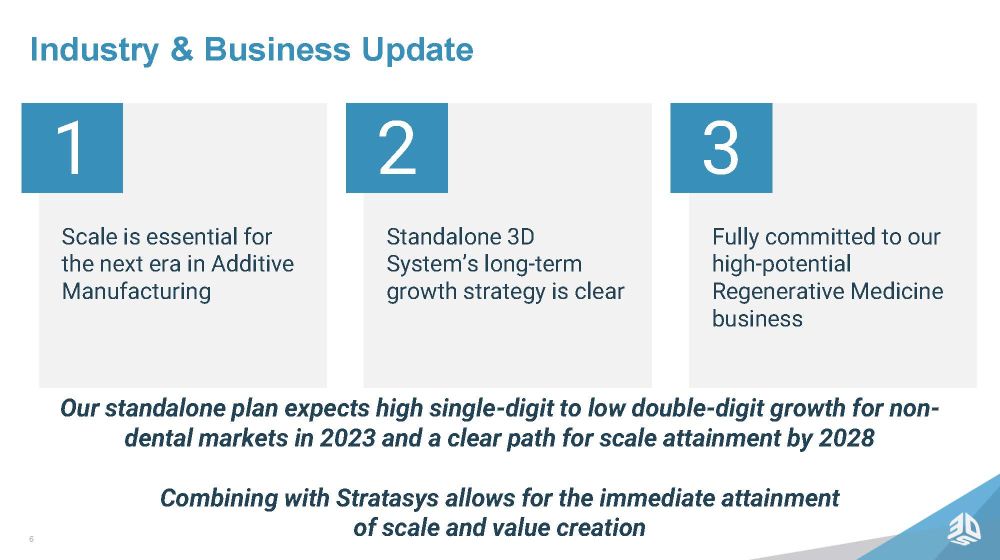 Industry & Business Update 6 Healthcare Standalone 3D System’s long - term growth strategy is clear 2 Fully committed to our high - potential Regenerative Medicine business 3 Scale is essential for the next era in Additive Manufacturing 1 Our standalone plan expects high single - digit to low double - digit growth for non - dental markets in 2023 and a clear path for scale attainment by 2028 Combining with Stratasys allows for the immediate attainment of scale and value creation