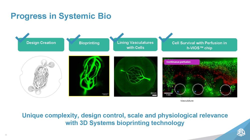 8 Progress in Systemic Bio Unique complexity, design control, scale and physiological relevance with 3D Systems bioprinting technology Design Creation Bioprinting Cell Survival with Perfusion in h - VIOS Œ chip Lining Vasculatures with Cells