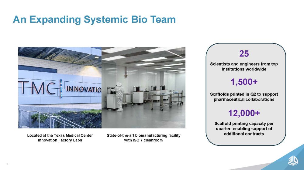 9 An Expanding Systemic Bio Team Located at the Texas Medical Center Innovation Factory Labs State - of - the - art biomanufacturing facility with ISO 7 cleanroom 25 Scientists and engineers from top institutions worldwide 1,500+ Scaffolds printed in Q2 to support pharmaceutical collaborations 12,000+ Scaffold printing capacity per quarter, enabling support of additional contracts