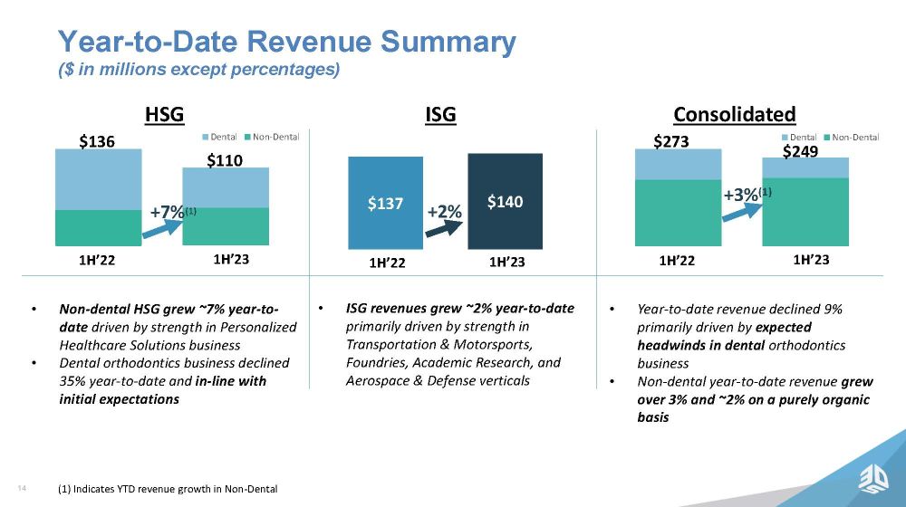 14 Year - to - Date Revenue Summary ($ in millions except percentages) Dental Non-Dental 1H’22 1H’23 $137 $140 1H’22 1H’23 HSG ISG Consolidated • Non - dental HSG grew ~7% year - to - date driven by strength in Personalized Healthcare Solutions business • Dental orthodontics business declined 35% year - to - date and in - line with initial expectations • ISG revenues grew ~2% year - to - date primarily driven by strength in Transportation & Motorsports, Foundries, Academic Research, and Aerospace & Defense verticals • Year - to - date revenue declined 9% primarily driven by expected headwinds in dental orthodontics business • Non - dental year - to - date revenue grew over 3% and ~2% on a purely organic basis $136 $110 Dental Non-Dental 1H’22 1H’23 $273 $249 +7% (1) +3% (1) +2% (1) Indicates YTD revenue growth in Non - Dental