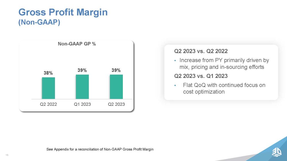 15 Gross Profit Margin (Non - GAAP) Q2 2023 vs. Q2 2022 • Increase from PY primarily driven by mix, pricing and in - sourcing efforts Q2 2023 vs. Q1 2023 • Flat QoQ with continued focus on cost optimization See A ppendix for a reconciliation of N on - GAAP Gross Profit Margin 38% 39% 39% Q2 2022 Q1 2023 Q2 2023 Non - GAAP GP %