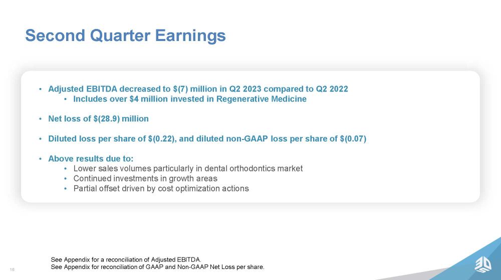 16 Second Quarter Earnings • Adjusted EBITDA decreased to $(7) million in Q2 2023 compared to Q2 2022 • Includes over $4 million invested in Regenerative Medicine • Net loss of $(28.9) million • Diluted loss per share of $(0.22), and diluted non - GAAP loss per share of $(0.07) • Above results due to: • Lower sales volumes particularly in dental orthodontics market • Continued investments in growth areas • Partial offset driven by cost optimization actions See A ppendix for a reconciliation of Adjusted EBITDA. See Appendix for reconciliation of GAAP and Non - GAAP Net Loss per share.