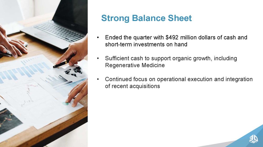 17 Strong Balance Sheet • Ended the quarter with $ 492 million dollars of cash and short - term investments on hand • Sufficient cash to support organic growth, including Regenerative Medicine • Continued focus on operational execution and integration of recent acquisitions