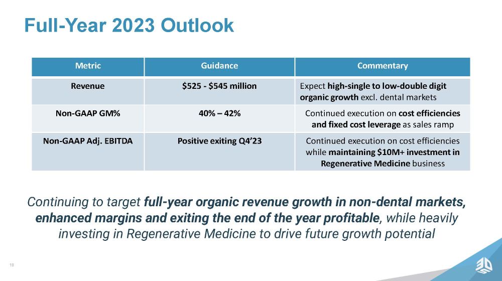 18 Full - Year 2023 Outlook Commentary Guidance Metric Expect high - single to low - double digit organic growth excl. dental markets $525 - $545 million Revenue Continued execution on cost efficiencies and fixed cost leverage as sales ramp 40% – 42% Non - GAAP GM% Continued execution on cost efficiencies while maintaining $10M+ investment in Regenerative Medicine business Positive exiting Q4’23 Non - GAAP Adj. EBITDA Continuing to target full - year organic revenue growth in non - dental markets, enhanced margins and exiting the end of the year profitable , while heavily investing in Regenerative Medicine to drive future growth potential